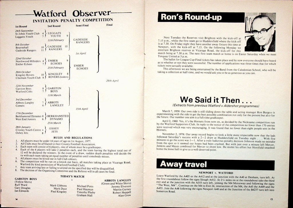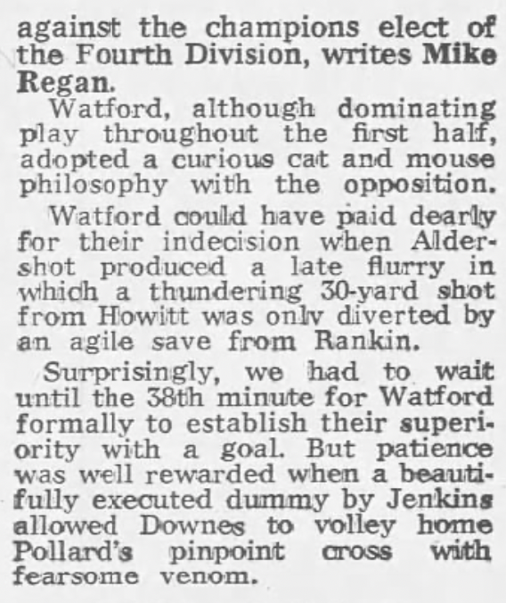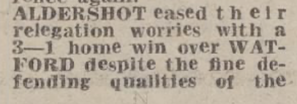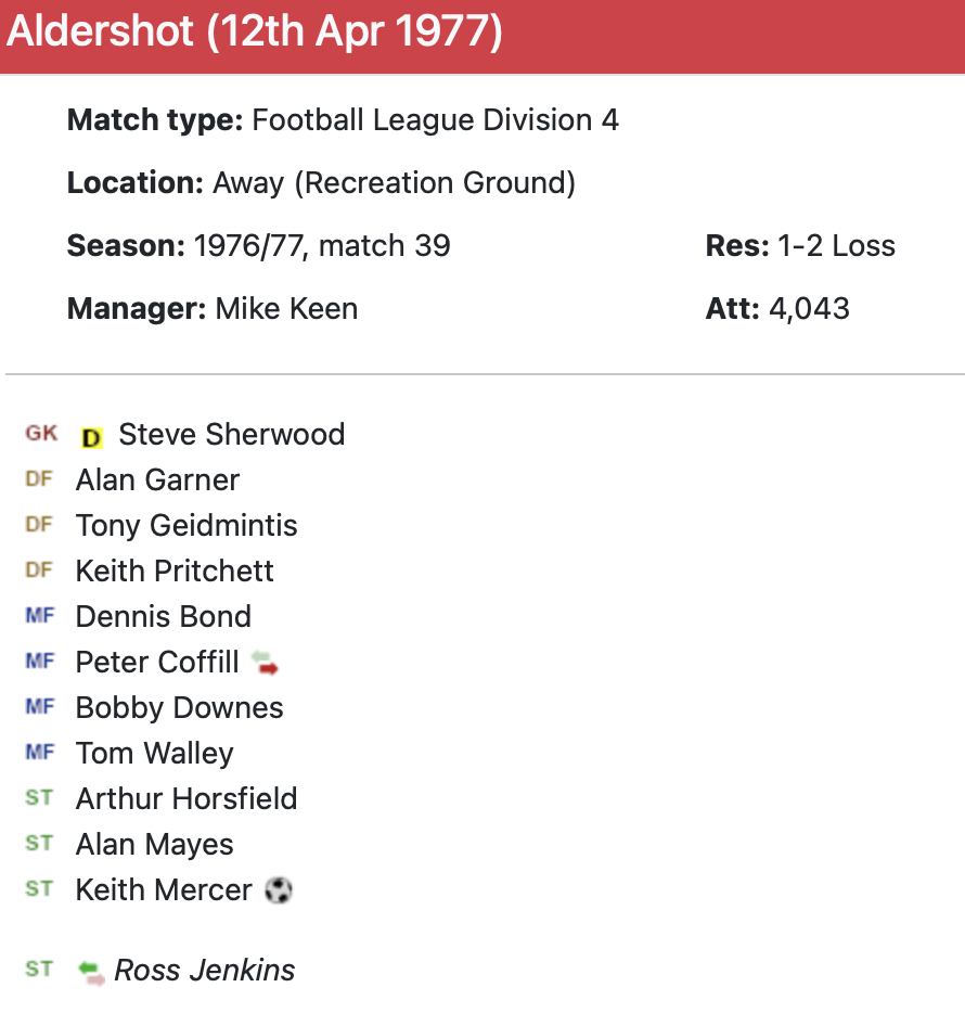 12th April 1977- Division Four, Aldershot 2 Watford 1 https://watford.fcdb.info/index.php?page=matches Watford Observer match report Daily Telegraph,13 Apr 1977 Share this: Click to share on X (Opens in new window) X Click to share on Facebook (Opens in new window) Facebook