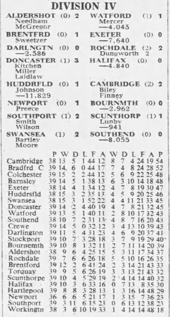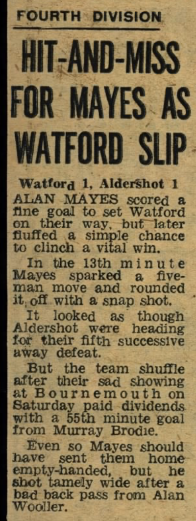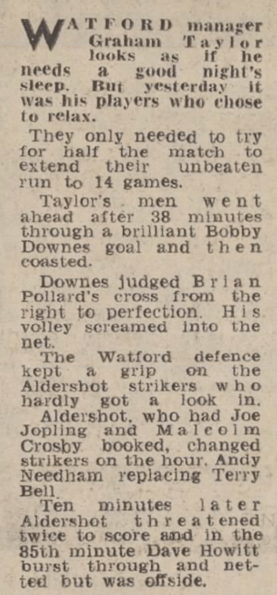 11th March 1978- Division Four, Watford 1 Aldershot 0 Leave a Reply Sunday Telegraph, 12 Mar 1978 Sunday Mirror, 12 Mar 1978 Watford Observer match report https://www.soccerbase.com/matches/results.sd?date=1978-03-11 https://www.11v11.com/league-tables/league-division-four/11-march-1978/ Share this: Click to share on X (Opens in new window) X Click to share on Facebook (Opens in new window) Facebook