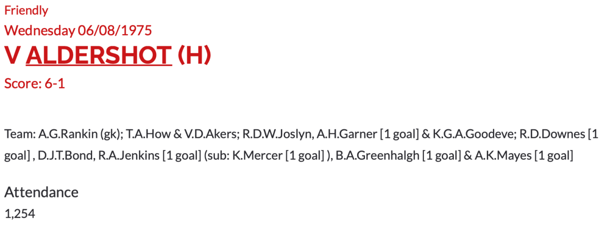 6th August 1975- Friendly, Watford 6 Aldershot 1 https://www.watfordfcarchive.co.uk/fixture/1975-08-06 Watford Observer match report Share this: Click to share on X (Opens in new window) X Click to share on Facebook (Opens in new window) Facebook