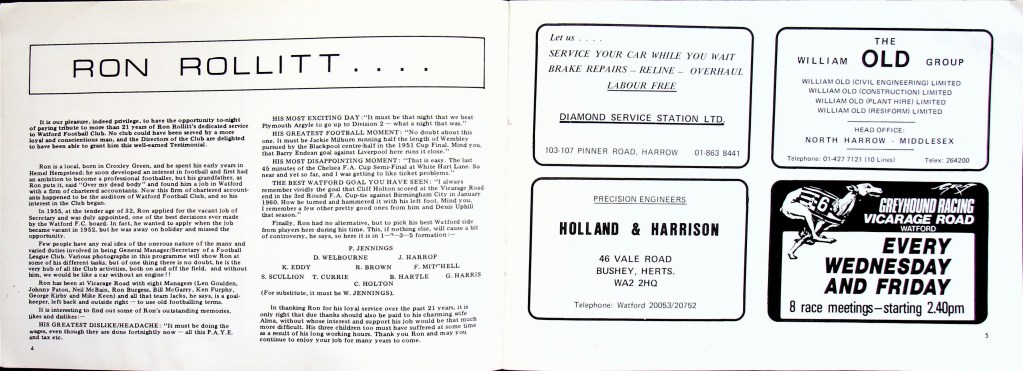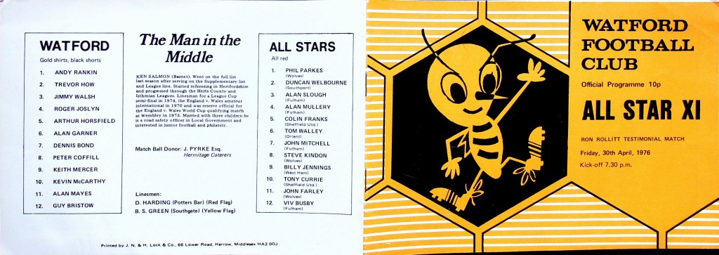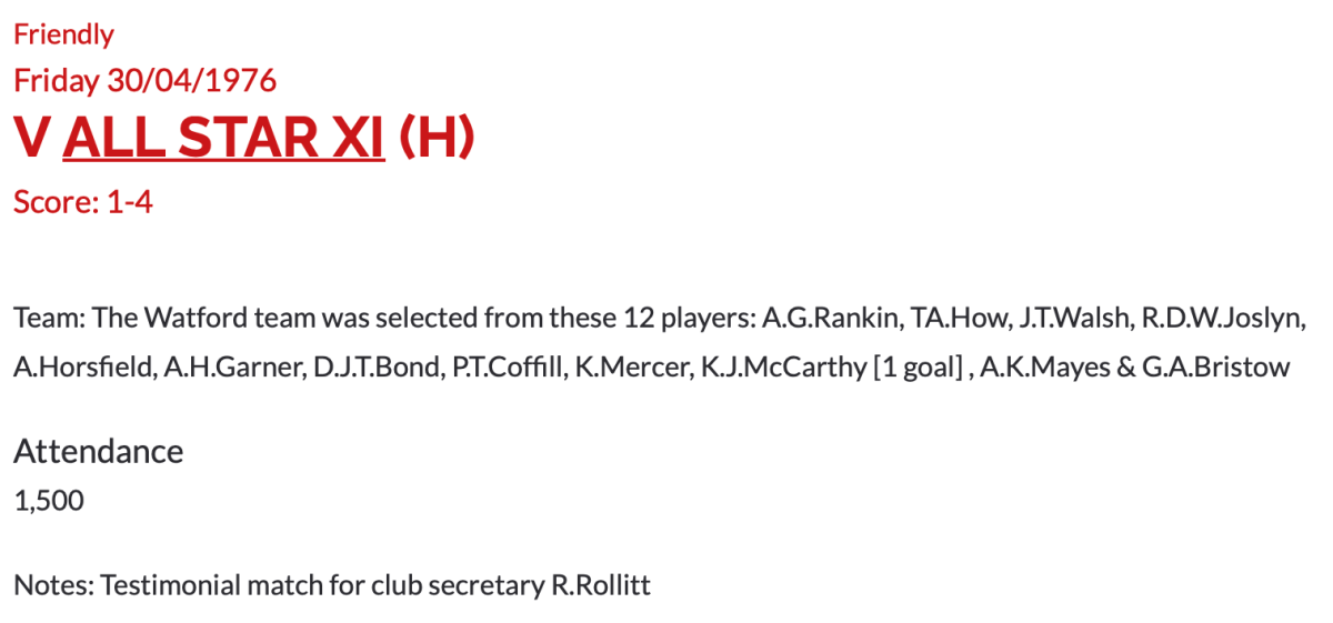 30th April 1976- Ron Rollitt Testimonial Match, Watford 1 All Star XI 4 Leave a Reply https://www.watfordfcarchive.co.uk/fixture/1976-04-30 Watford Observer match report Share this: Click to share on X (Opens in new window) X Click to share on Facebook (Opens in new window) Facebook