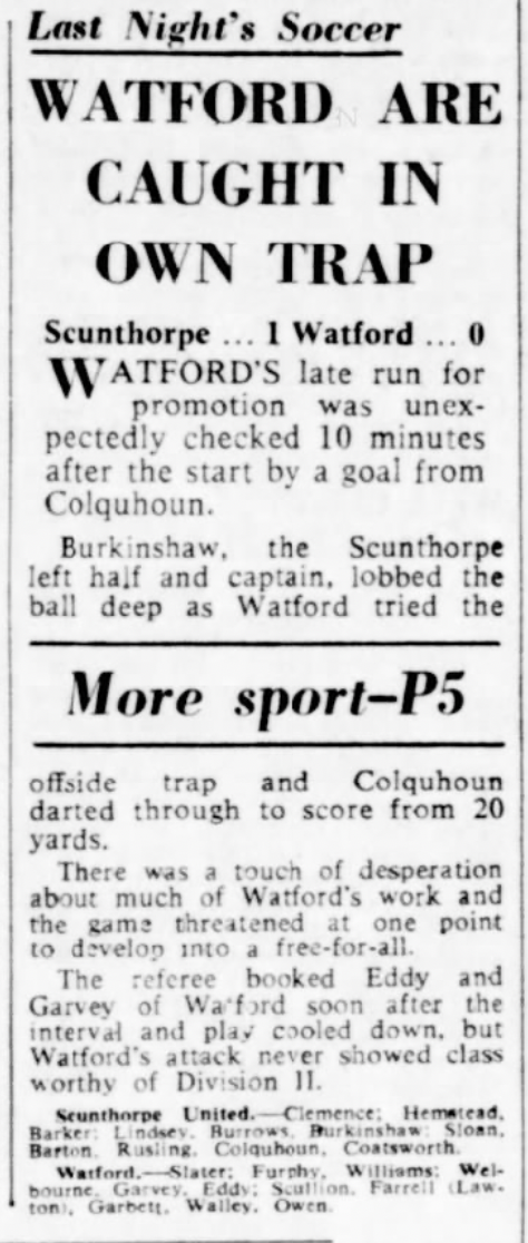 14th April 1967- Division Three, Scunthorpe United 1 Watford 0 Leave a Reply http://watford.fcdb.info?id=2672 Daily Telegraph, 15 Apr 1967 Watford Observer match report https://www.soccerbase.com/matches/results.sd?date=1967-04-14 https://www.11v11.com/league-tables/league-division-three/14-april-1967/ Share this: Share on X (Opens in new window) X Share on Facebook (Opens in new window) Facebook
