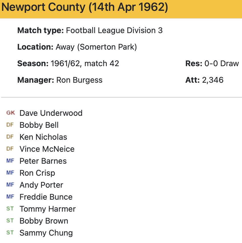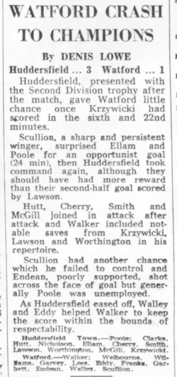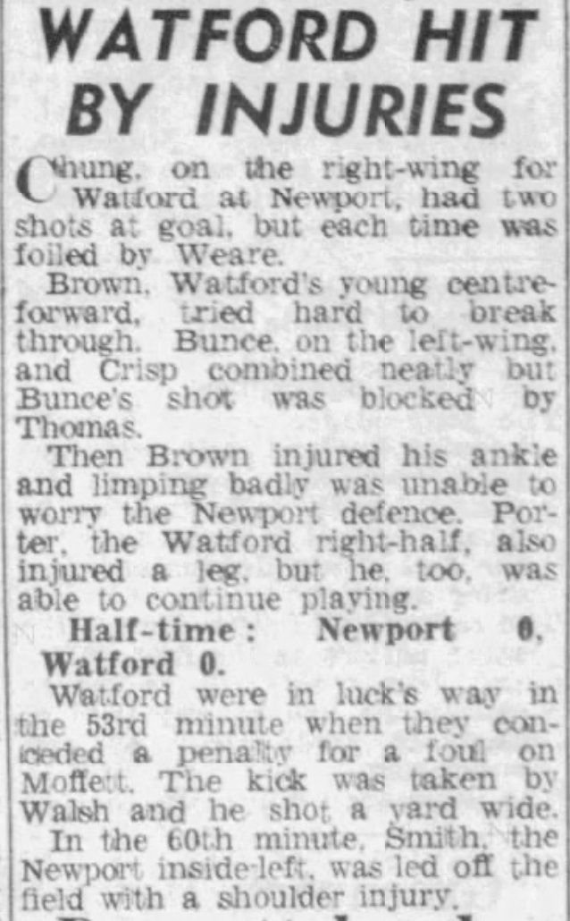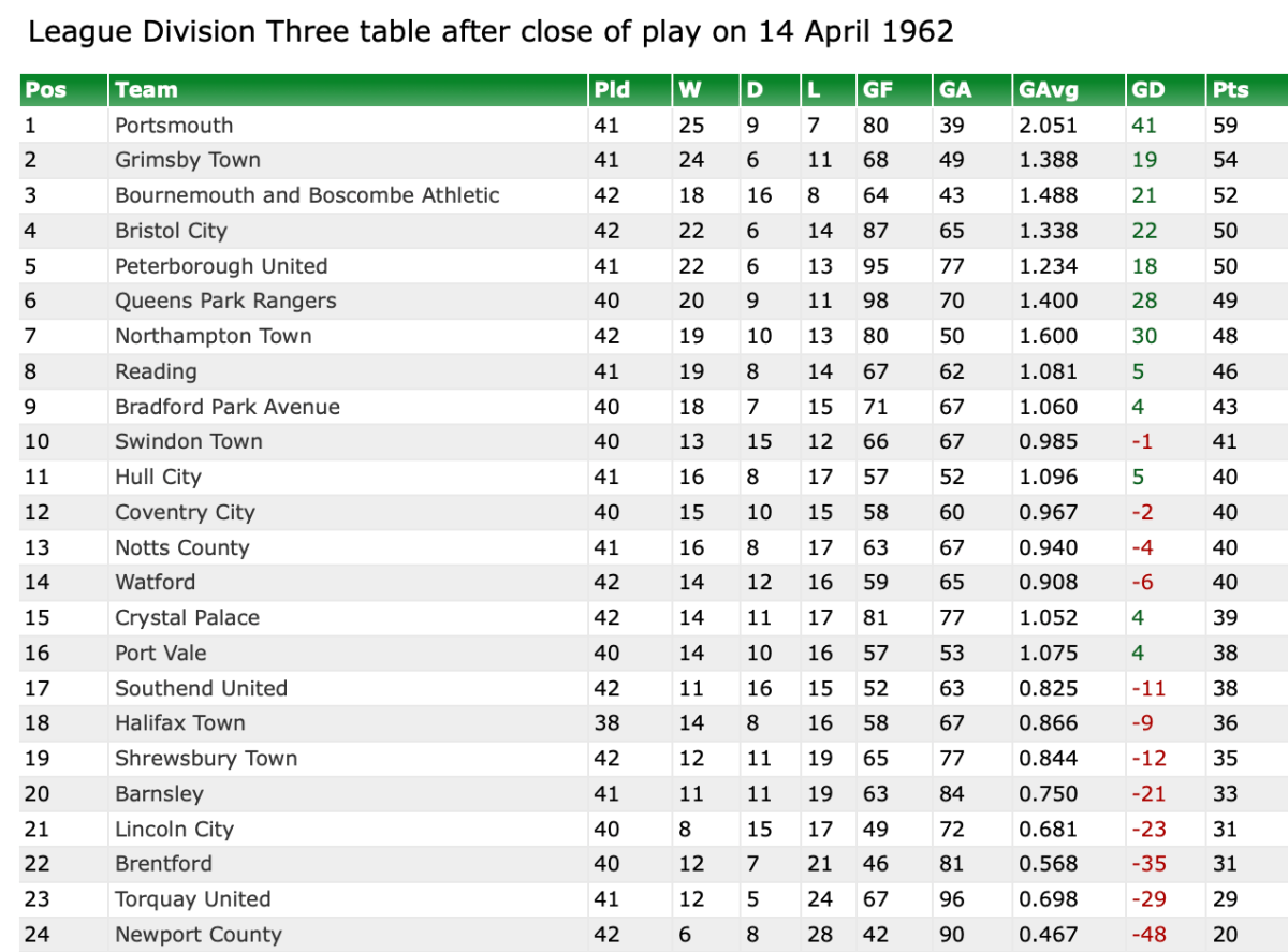 14th April 1962- Division Three, Newport County 0 Watford 0 http://watford.fcdb.info/index.php?page=matches Evening Standard, 14 Apr 1962 Sunday People, 15 Apr 1962 Watford Observer match report https://www.soccerbase.com/matches/results.sd?date=1962-04-14 https://www.11v11.com/league-tables/league-division-three/14-april-1962/ Share this: Share on X (Opens in new window) X Share on Facebook (Opens in new window) Facebook