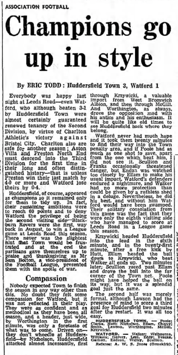 14th April 1970- Division Two, Huddersfield Town 3 Watford 1 Leave a Reply http://watford.fcdb.info?id=2832 Daily Telegraph, 15 Apr 1970 Guardian, 15 Apr 1970 Guardian Journal, 15 Apr 1970 Watford Observer match report https://www.soccerbase.com/matches/results.sd?date=1970-04-14 https://www.11v11.com/league-tables/league-division-two/14-april-1970/ Share this: Share on X (Opens in new window) X Share on Facebook (Opens in new window) Facebook