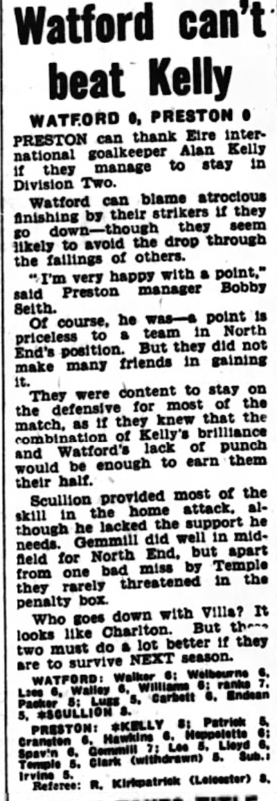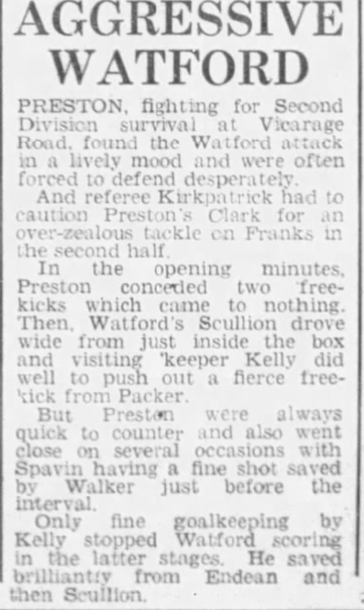 4th April 1970- Division Two, Watford 0 Preston North End 0 Leave a Reply http://watford.fcdb.info?id=2829 Evening Standard, 4 Apr 1970 Sunday People, 5 Apr 1970 Watford Observer match report Share this: Share on X (Opens in new window) X Share on Facebook (Opens in new window) Facebook