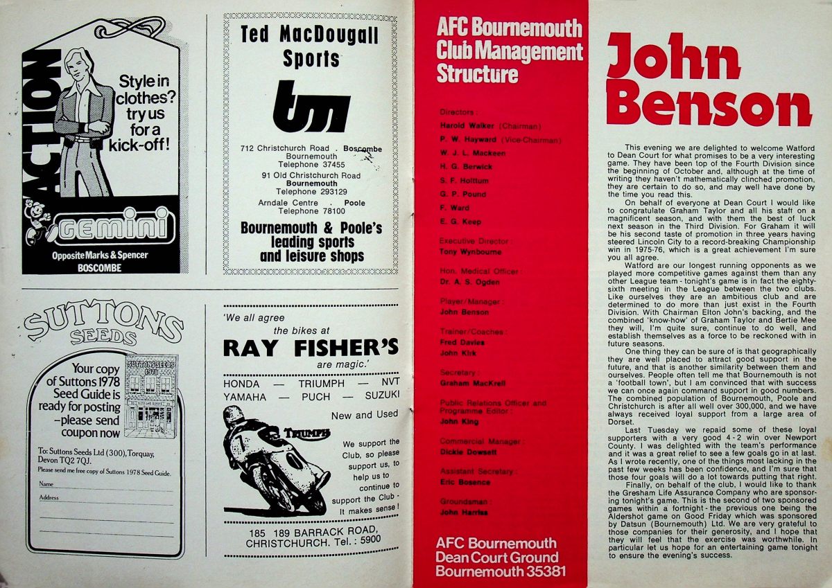 4th April 1978- Division Four, AFC Bournemouth 1 Watford 2 This win clinched our promotion to Division Three. Programme images courtesy of Matt Hall http://watford.fcdb.info/index.php The Guardian, 5 Apr 1978 Watford Observer match report https://www.soccerbase.com/matches/results.sd?date=1978-04-04 https://www.11v11.com/league-tables/league-division-four/04-april-1978/ Share this: Share on X (Opens in new window) X Share on Facebook (Opens in new window) Facebook