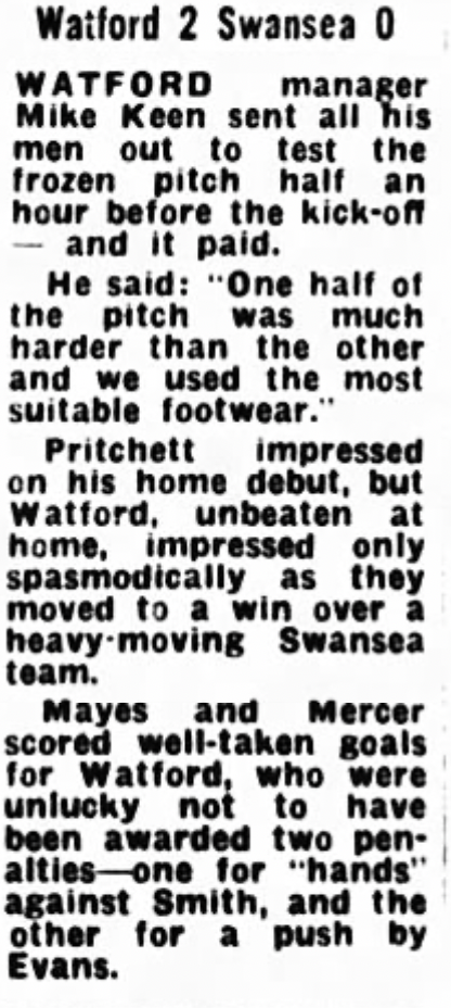 4th December 1976- Division Four, Watford 2 Swansea City 0 Leave a Reply http://watford.fcdb.info?s=41418&id=3148 Sunday People,5 Dec 1975 Share this: Click to share on X (Opens in new window) X Click to share on Facebook (Opens in new window) Facebook