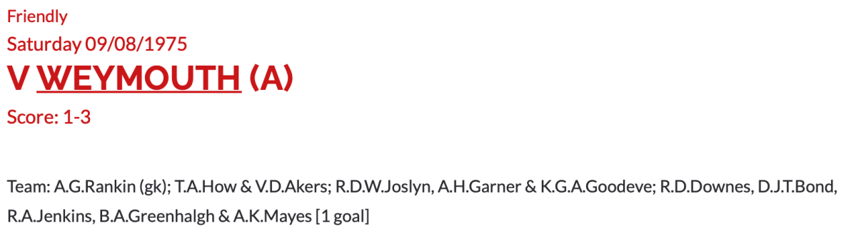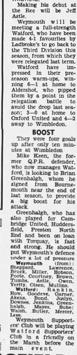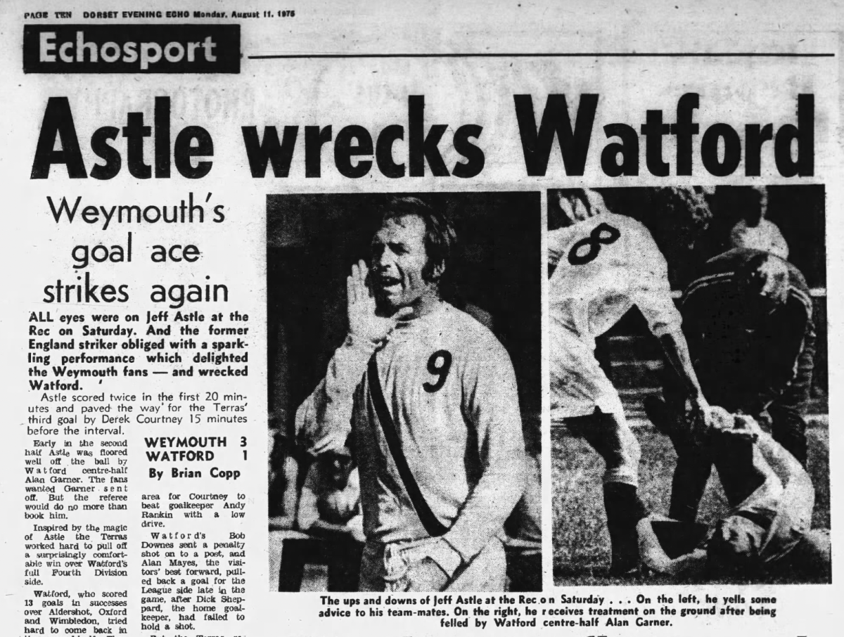 9th August 1975- Friendly, Weymouth 3 Watford 1 Dorset Echo, 8 Aug 1975 https://www.watfordfcarchive.co.uk/fixture/1975-08-09 Dorset Echo, 11 Aug 1975 Watford Observer match report Share this: Share on X (Opens in new window) X Share on Facebook (Opens in new window) Facebook