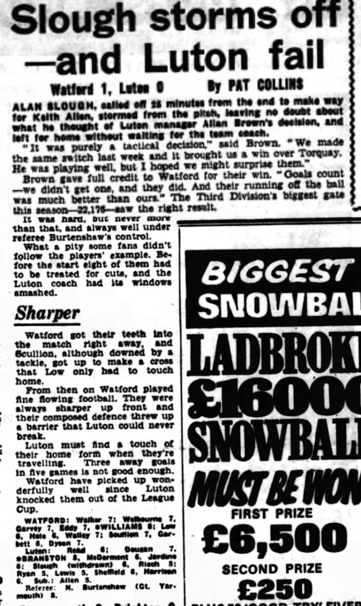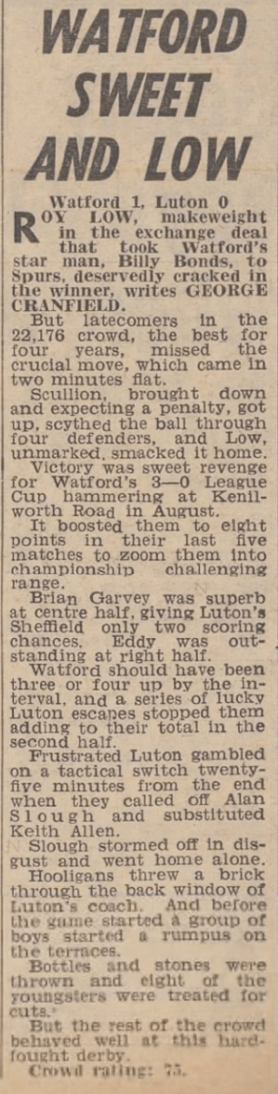5th October 1968- Division Three, Watford 1 Luton Town 0 Leave a Reply Sunday Mirror, 6 Oct 196 Sunday People, 6 Oct 1968 Watford Observer match report 13th September 2003- New Division One, Watford 3 Millwall 1 Share this: Share on X (Opens in new window) X Share on Facebook (Opens in new window) Facebook