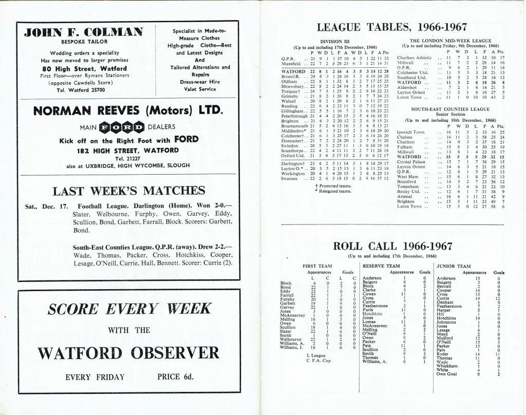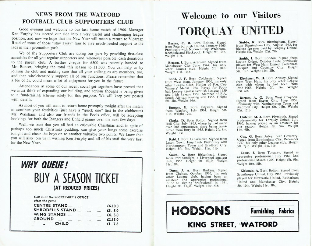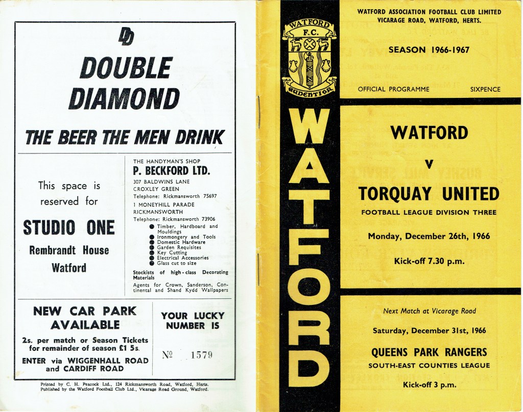 26th December 1966- Division Three, Watford 2 Torquay United 1 Leave a Reply Watford Observer match report https://www.soccerbase.com/matches/results.sd?date=1966-12-26 https://www.11v11.com/league-tables/league-division-three/26-december-1966/ Share this: Click to share on X (Opens in new window) X Click to share on Facebook (Opens in new window) Facebook
