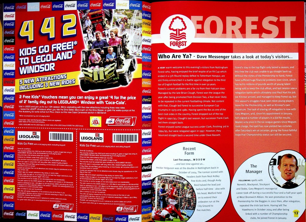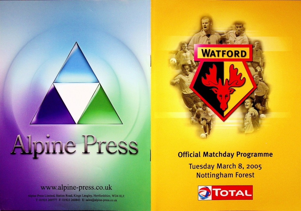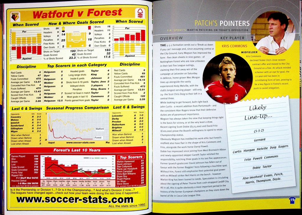 8th March 2005- Championship, Watford 0 Nottingham Forest 2 Leave a Reply Kris Commons scored twice against Watford to earn Nottingham Forest three key points in their relegation battle. The physical presence of Forest’s defence made life difficult for Watford, though, and the closest Ray Lewington’s team came to hitting the target was when Johnnie Jackson steered his header wide from an awkward angle. “Stumble-john”, or “blunderer”, sums up the Watford performance fairly well, granting naive Nottingham Forest fans blind optimism in the hope that they may well avoid relegation after all. https://www.soccerbase.com/matches/results.sd?date=2005-03-08 https://www.11v11.com/league-tables/league-championship/08-march-2005/ Share this: Click to share on X (Opens in new window) X Click to share on Facebook (Opens in new window) Facebook