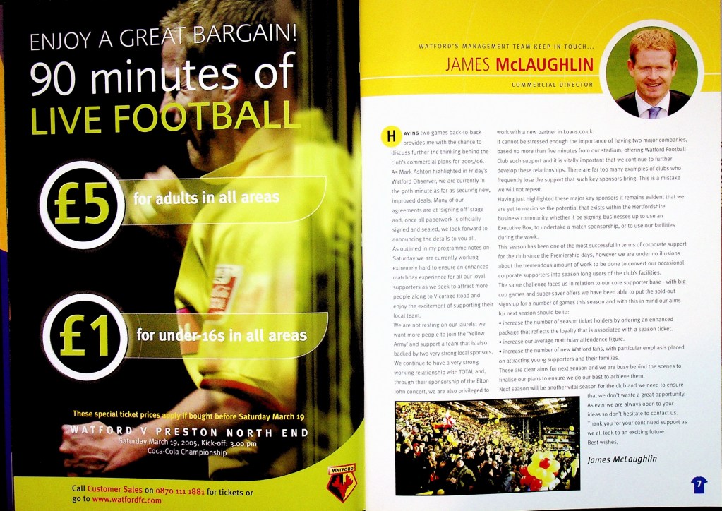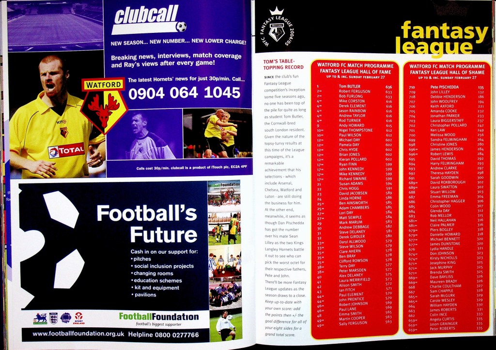 5th August 2003- Friendly, Watford 1 Chelsea 4 Leave a Reply BSAD report:Â You know a big team is in town when the unofficial merchandise stands are outside the ground, selling the latest moody tat to the most gullible members of the visiting support. When touts ask if you have any spare tickets (yeah, like a tout is going to make a killing on the mark-up of pre-season tickets. “How much, mate? Twenty notes? I’ll just go to the pub, then.”) and when the Chelsea TV cameras are out in force. The young presenter looked visibly bored as she attempted to engage a particularly half-witted individual in conversation about Damien Duff as I walked past. Share this: Click to share on X (Opens in new window) X Click to share on Facebook (Opens in new window) Facebook