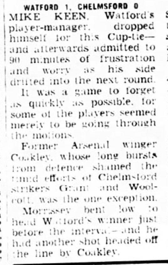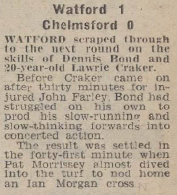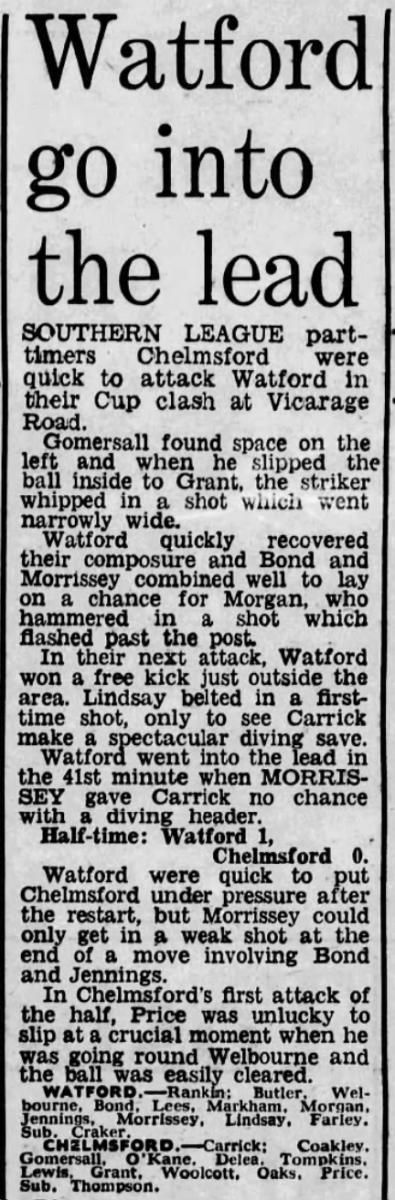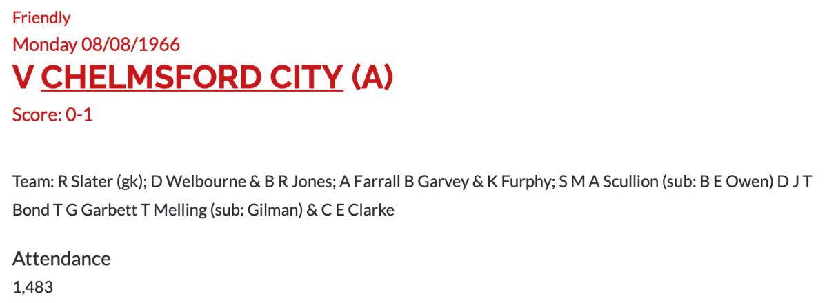 8th August 1966- Friendly, Chelmsford City 1 Watford 0 https://www.watfordfcarchive.co.uk/fixture/1966-08-08 Watford Observer match report Share this: Click to share on X (Opens in new window) X Click to share on Facebook (Opens in new window) Facebook