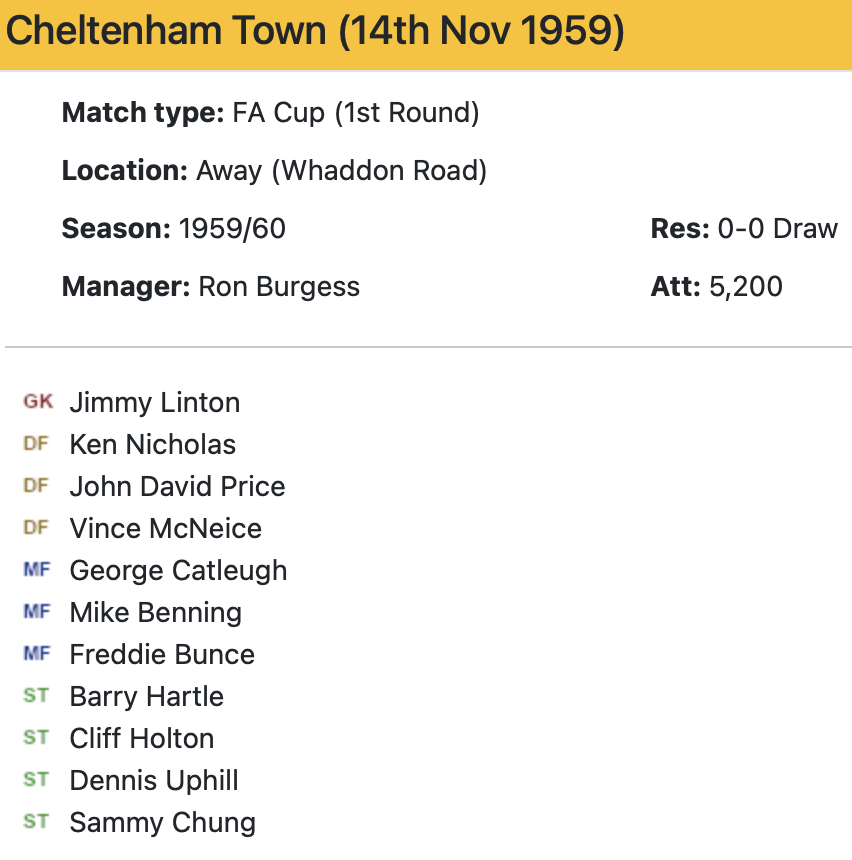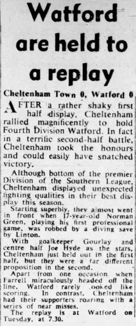 14th November 1959- FA Cup First Round, Cheltenham Town 0 Watford 0 http://watford.fcdb.info/index.php Sunday Mirror, 15 Nov 1959 Sunday Mercury, 15 Nov 1959 Watford Observer match report https://www.soccerbase.com/matches/results.sd?date=1959-11-14 Share this: Share on X (Opens in new window) X Share on Facebook (Opens in new window) Facebook