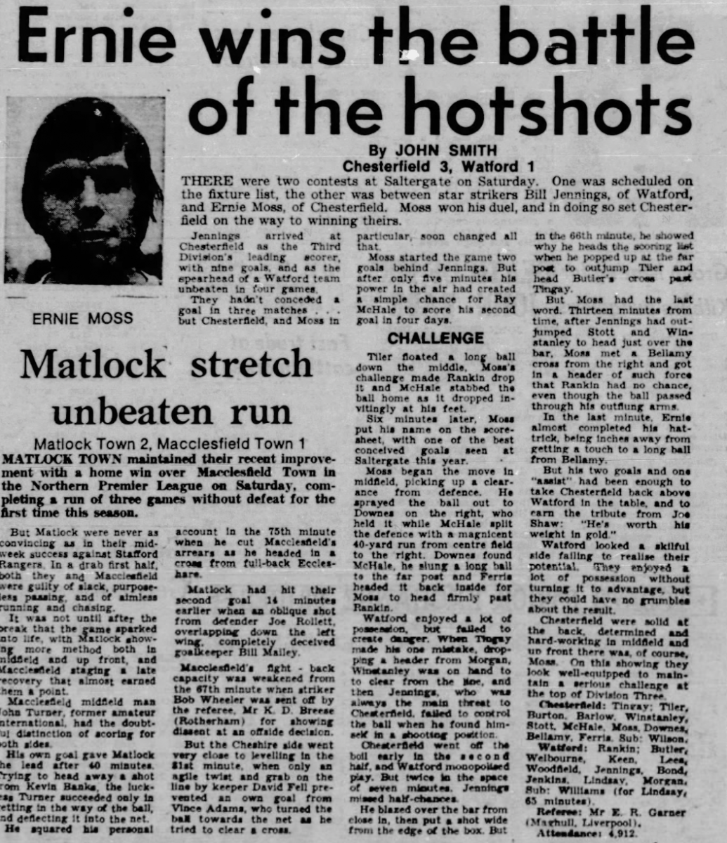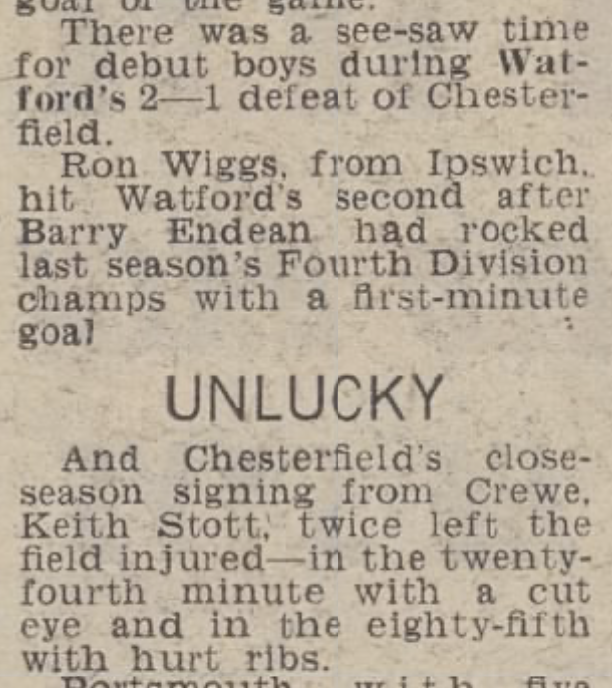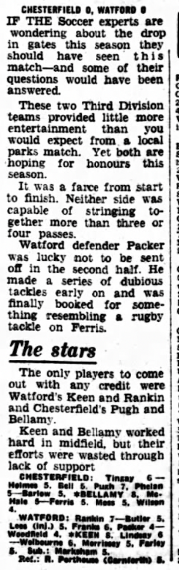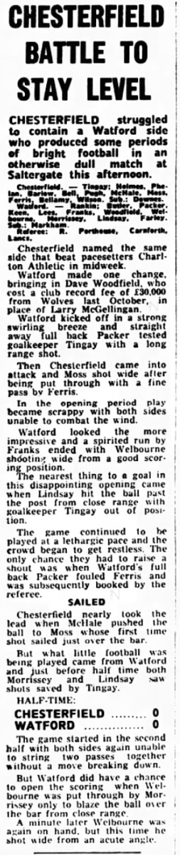 1st August 1970- Friendly, Chesterfield 1 Watford 2 https://www.watfordfcarchive.co.uk/fixture/1970-08-01 Derby Evening Telegraph, 1 Aug 1970 Sunday Mirror, 2 Aug 1970 Guardian Journal, 3 Aug 1970 Watford Observer match report Share this: Share on X (Opens in new window) X Share on Facebook (Opens in new window) Facebook