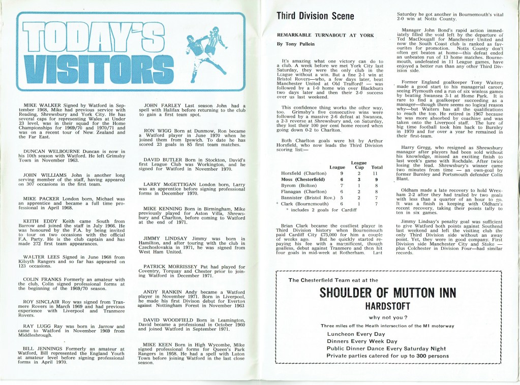 21st October 1972- Division Three, Chesterfield 0 Watford 0 Leave a Reply http://watford.fcdb.info?s=32578&id=2943 Nottingham Football Post, 21 Oct 1972 Sunday Mirror, 22 Oct 1972 Sunday People, 22 Oct 1972 Watford Observer match report Share this: Share on X (Opens in new window) X Share on Facebook (Opens in new window) Facebook