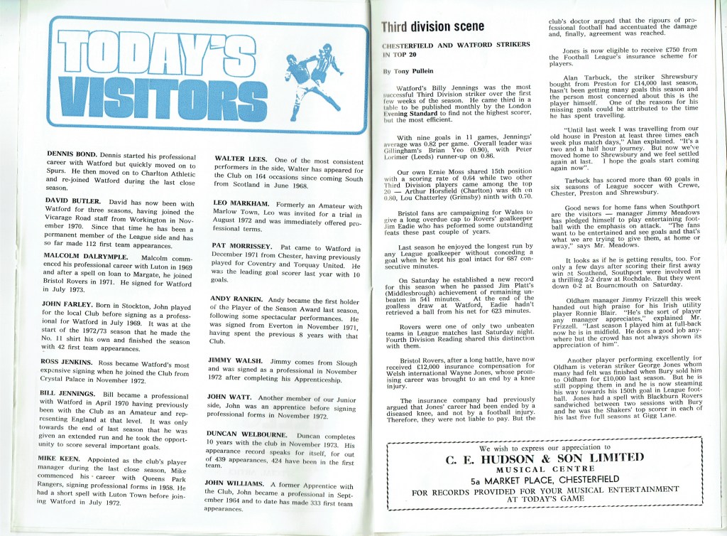 16th February 1974- Division Three, Watford 2 Chesterfield 1 Leave a Reply https://watford.fcdb.info/index.php?page=matches Evening Standard, 16 Feb 1974 Sunday People, 17 Feb 1974 Watford Observer match report Share this: Share on X (Opens in new window) X Share on Facebook (Opens in new window) Facebook