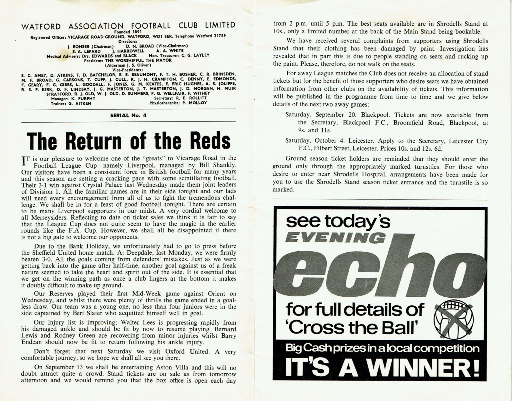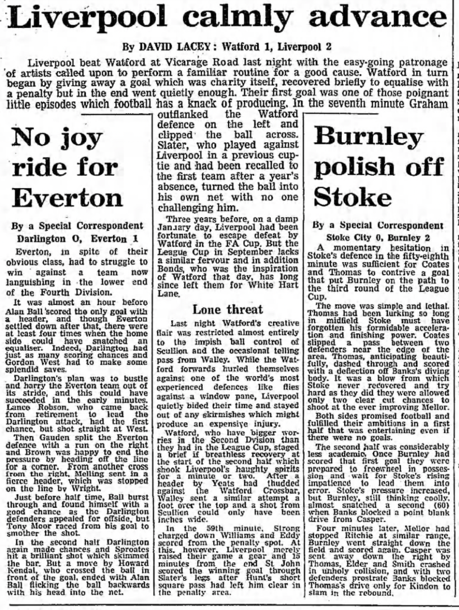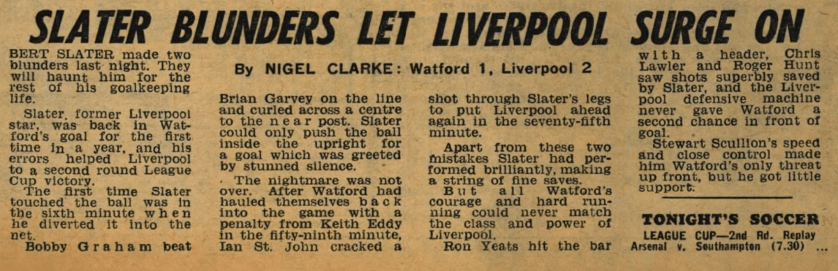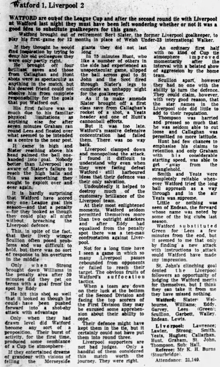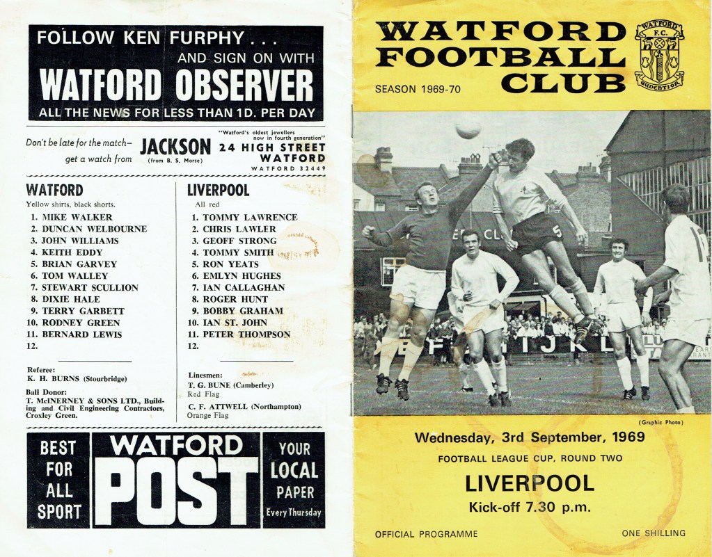 3rd September 1969- League Cup Second Round, Watford 1 Liverpool 2 Leave a Reply http://watford.fcdb.info?id=3771 Daily Mirror, 4 Sep 1969 Daily Telegraph, 4 Sep 1969 Guardian, 4 Sep 1969 Liverpool Daily Post, 4 Sep 1969 Watford Observer match report Share this: Share on X (Opens in new window) X Share on Facebook (Opens in new window) Facebook
