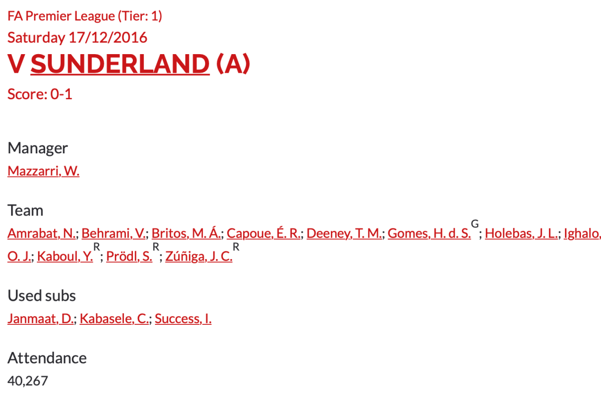 17th December 2016- Premier League, Sunderland 1 Watford 0 Leave a Reply https://www.watfordfcarchive.co.uk/fixture/2016-12-17 Relive Sunderland v Watford: Hornets fall to fourth defeat from five in north east Hornets slump to defeat at struggling Sunderland Watford boss Mazzarri blames defeat on missed chances Share this: Share on X (Opens in new window) X Share on Facebook (Opens in new window) Facebook