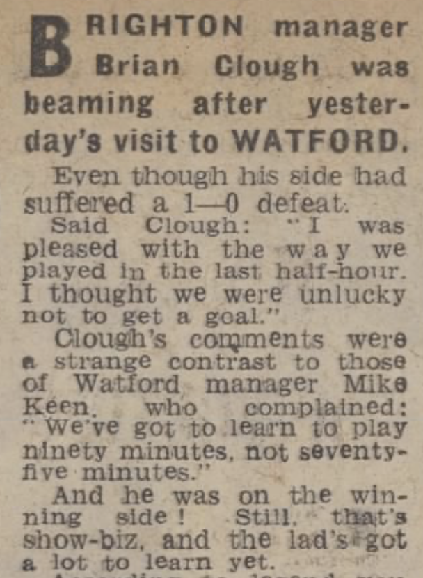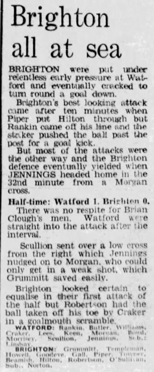 22nd December 1973- Division Three, Watford 1 Brighton & Hove Albion 0 Leave a Reply https://watford.fcdb.info/index.php?page=matches Evening Standard, 22 Dec 1973 Sunday Mirror, 23 Dec 1973 Watford Observer match report Share this: Share on X (Opens in new window) X Share on Facebook (Opens in new window) Facebook