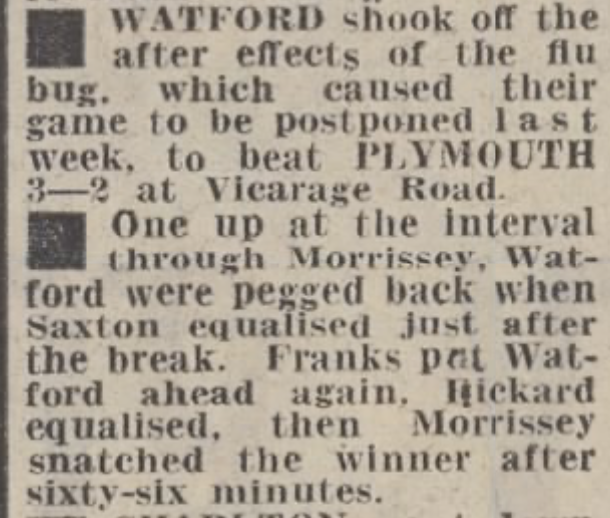 23rd December 1972- Division Three, Watford 3 Plymouth Argyle 2 Leave a Reply https://watford.fcdb.info/index.php?page=matches Evening Standard, 23 Dec 1972 Sunday Mirror, 24 Dec 1972 Sunday People 24 Dec 1972 Watford Observer match report Share this: Share on X (Opens in new window) X Share on Facebook (Opens in new window) Facebook