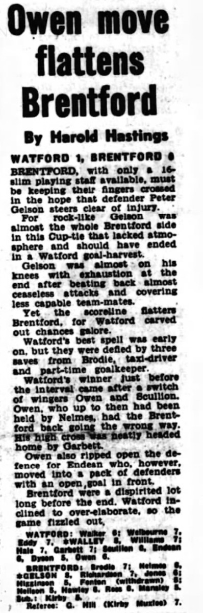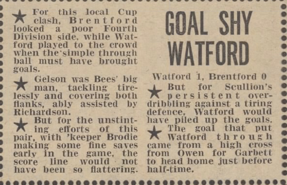 Due to an industrial dispute the paper wasn’t published this week. However as Watford didn’t have a game, it had been FA Cup weekend and they’d already been knocked out, no match reports were missed. The following week there was a page in the paper of ‘old’ stories that would have been in the paper but none concerned the football club.