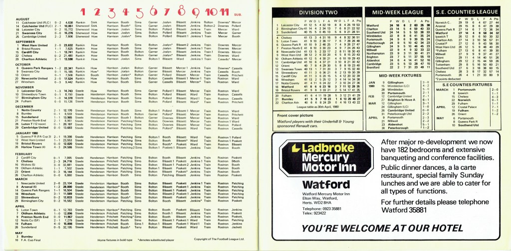 19th April 1980- Division Two, Watford 4 Fulham 0 Leave a Reply http://watford.fcdb.info?id=3337 English Division Two (old)Table »Birmingham City1-0Luton TownBristol Rovers2-2SunderlandCambridge United3-1BurnleyCardiff City0-1West Ham UnitedCharlton Athletic2-2Queens Park RangersChelsea1-0Notts CountyLeyton Orient2-2Preston North EndNewcastle United1-3Swansea CityShrewsbury Town0-1Oldham AthleticWatford4-0FulhamWrexham0-1Leicester City Share this: Click to share on X (Opens in new window) X Click to share on Facebook (Opens in new window) Facebook