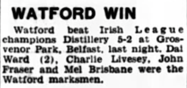 12th August 1963- Friendly, Distillery 2 Watford 5 Daily Herald, 13 Aug 1963 Share this: Share on X (Opens in new window) X Share on Facebook (Opens in new window) Facebook