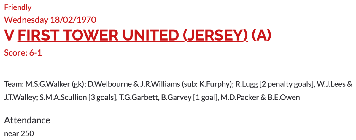 18th February 1970- Friendly, First Tower United (Jersey) 1 Watford 6 https://www.watfordfcarchive.co.uk/fixture/1970-02-18 Daily Telegraph, 19 Feb 1970 Watford Observer match report Share this: Click to share on X (Opens in new window) X Click to share on Facebook (Opens in new window) Facebook