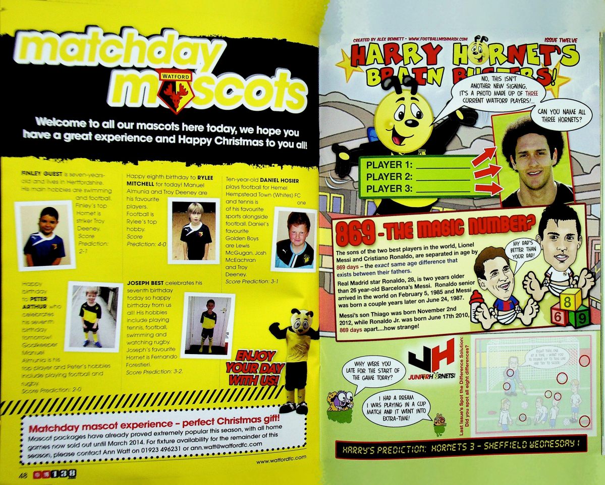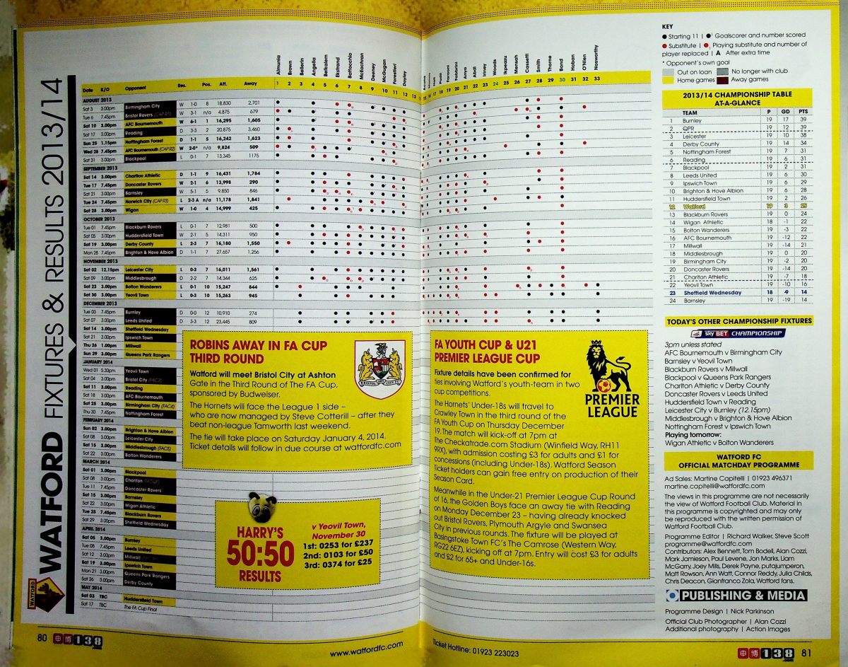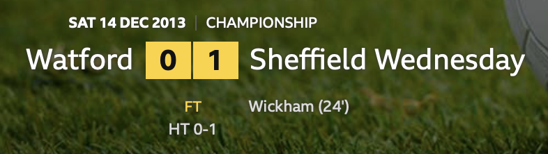 14th December 2013- Championship, Watford 0 Sheffield Wednesday 1 http://watford.fcdb.info/index.php?page=matches BBC: Sheffield Wednesday earned their first away victory of the season as Connor Wickham grabbed the only goal in their game at Watford. Wickham scored with a 20-yard free-kick for his fifth goal for the Owls since joining on loan from Sunderland. Sunday Telegraph, 15 Dec 2013 BHappy: You really have to wonder how we got here. Even those who didn’t expect this season to be a cakewalk, who anticipated difficult games at home as attitudes towards us changed and we had to adapt to new circumstances and a different squad, can’t have anticipated this. It stands to reason, of course, that last season’s flamboyant style was never something that was going to succeed in moderation; we’re not equipped to grind out results when the going is rough, less so given the summer departures. The viability of playing open, confident football is kinda dependent on the “confident” bit. Otherwise you’re just “open”, with the inevitable consequence that you’re rather easy to score against without the verve to overturn a side with something to cling on to. Nonetheless the chasm between the performances that yielded so many goals last season, goals that didn’t entirely desert us as we were finding our feet again early this, and performances that have yielded no goals in the last four at Vicarage Road is vast and would have been all but inconceivable even in the wake of the Wembley disappointment six months ago, a result that arguably did neither manager any favours at all. https://www.bbc.co.uk/sport/football/25275110 Share this: Click to share on X (Opens in new window) X Click to share on Facebook (Opens in new window) Facebook