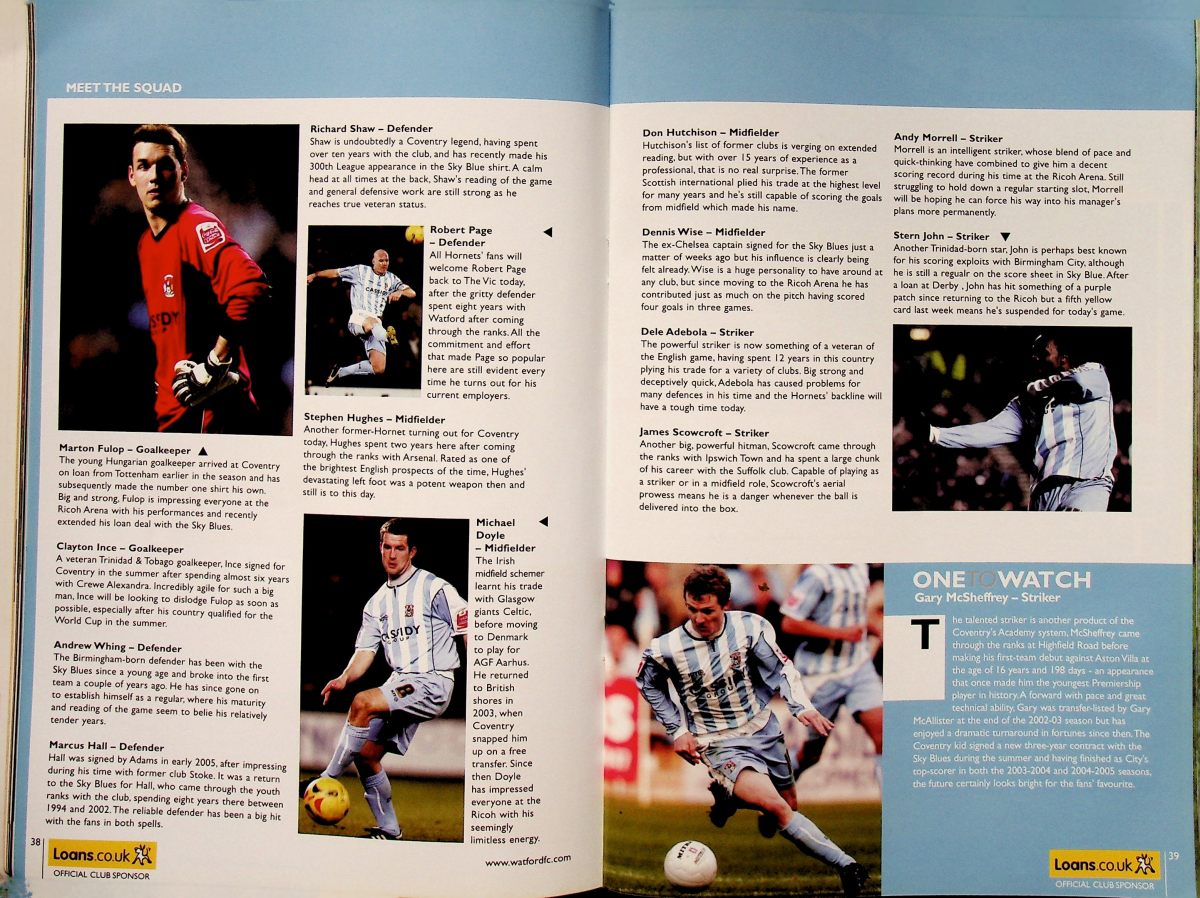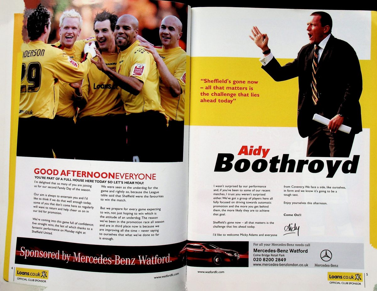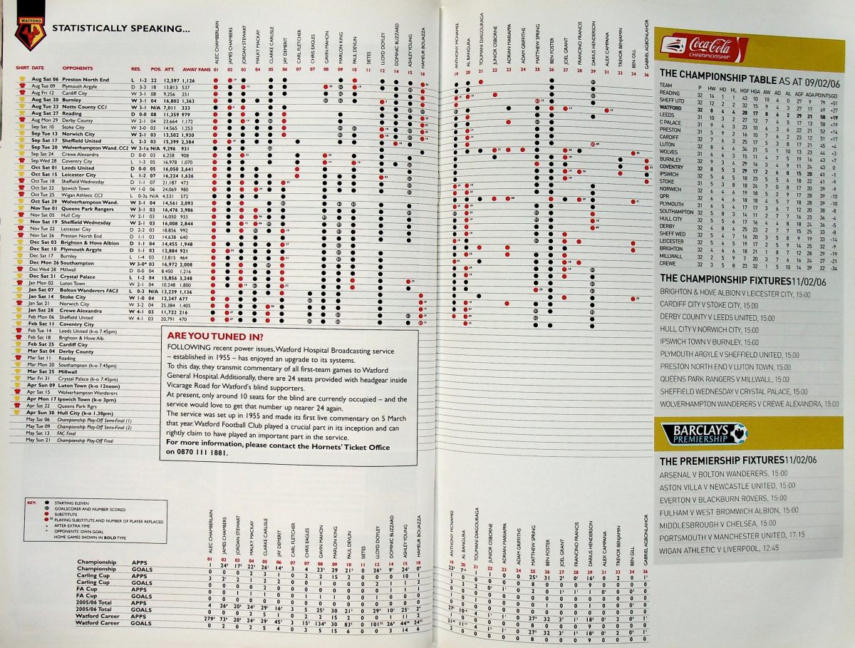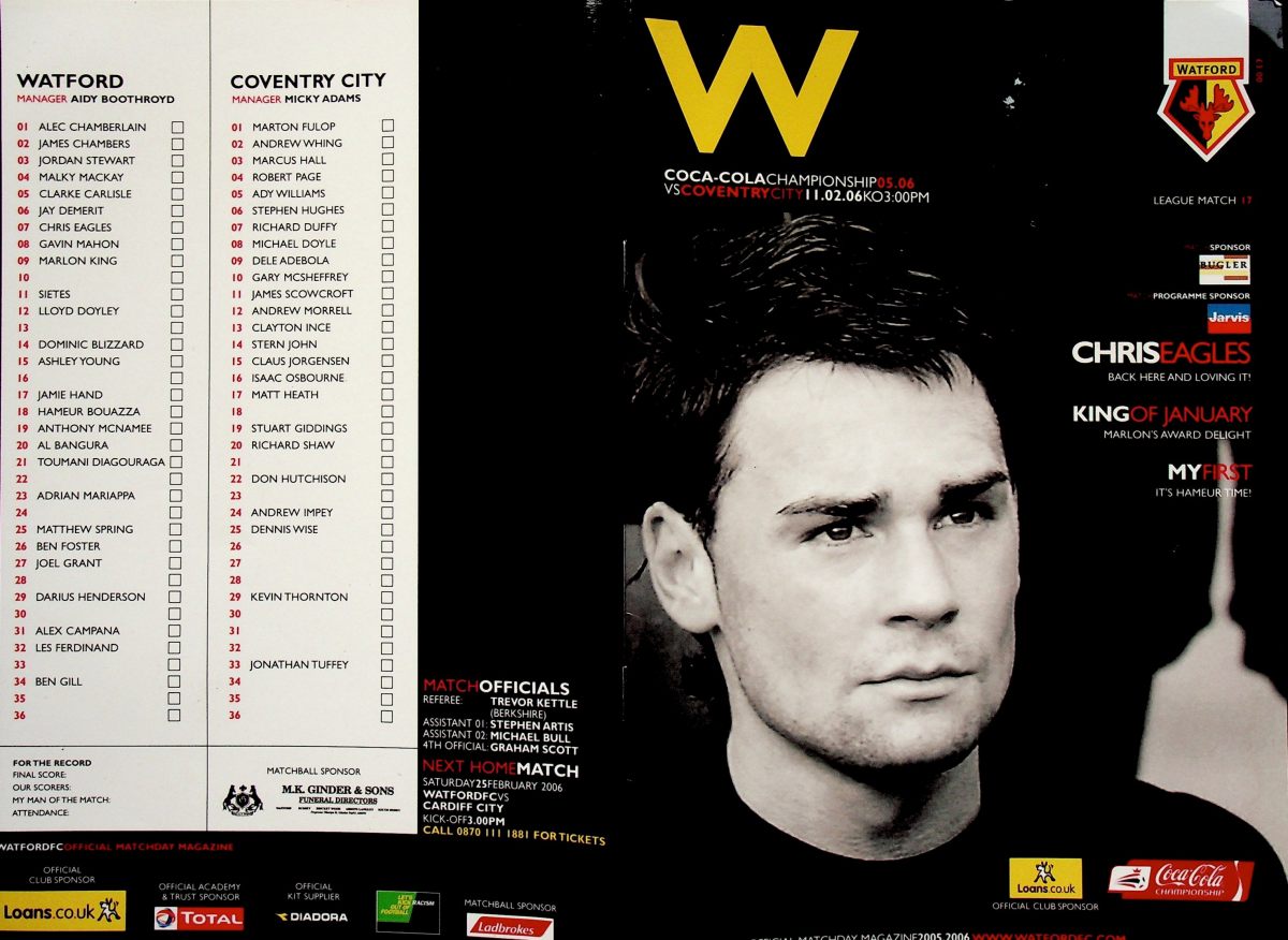 11th February 2006- Championship, Watford 4 Coventry City 0 Leave a Reply Ashley Young scored one and set up two more as Watford thrashed Coventry. Watford are the form side in the Championship and they continued their good run with a victory romp inspired by Ashley Young. He opened the scoring and set up goals for Marlon King and Darius Henderson before Jay DeMerit wrapped up the points. Eighteen goals in six games, six wins on the trot and the first sell-out for six seasons. Yet Watford’s manager Adrian Boothroyd says: “I don’t want anybody to get excited.” Who is he trying to kid? Eleven goals in three games, five wins in a row, third in the table and Sheffield United suddenly looking human and utterly catchable meant that the challenge provided by the arrival of Coventry City, on a good run themselves, was clear. Could Boothroyd keep his players’ feet on the ground, stave off complacency and follow up the excellent win at Bramall Lane with another three points? More questions being asked of this Watford team, and more answers being emphatically provided. Independent, 12 Feb 2006 Sunday Mirror, 12 Feb 2006 https://www.soccerbase.com/matches/results.sd?date=2006-02-11 https://www.11v11.com/league-tables/league-championship/11-february-2006/ Share this: Share on X (Opens in new window) X Share on Facebook (Opens in new window) Facebook