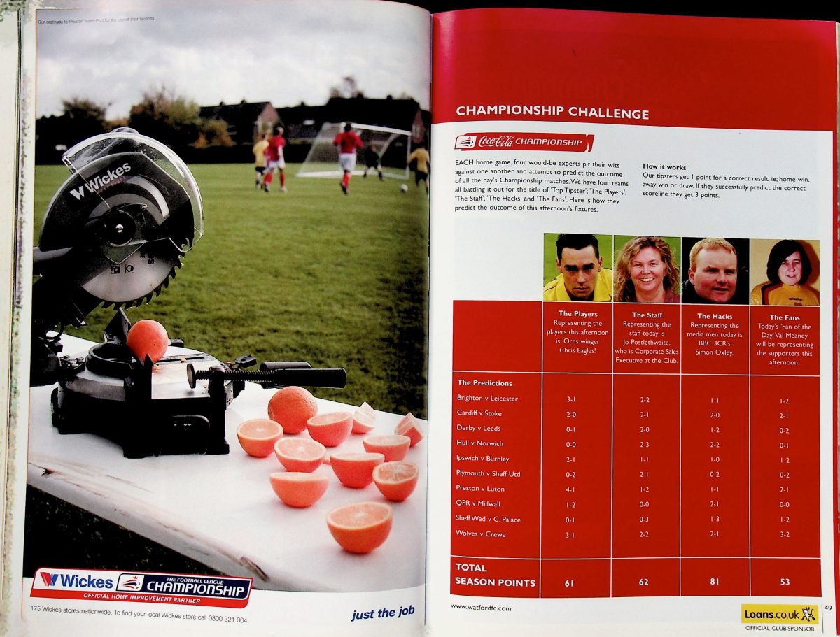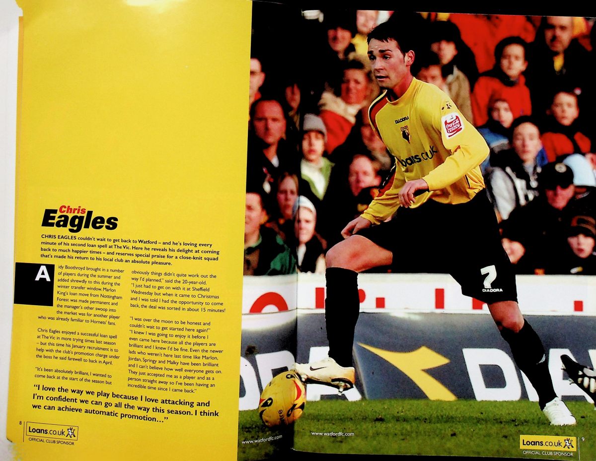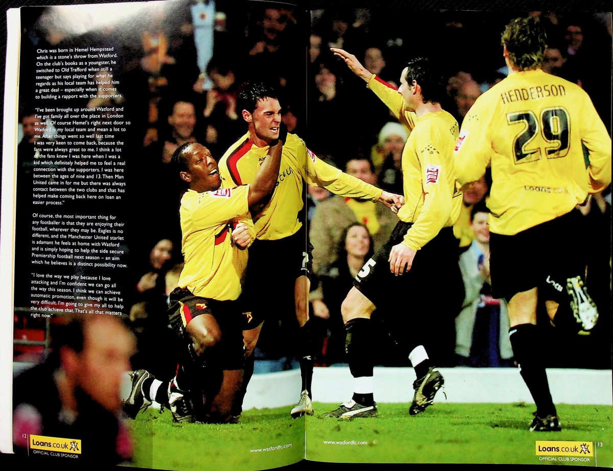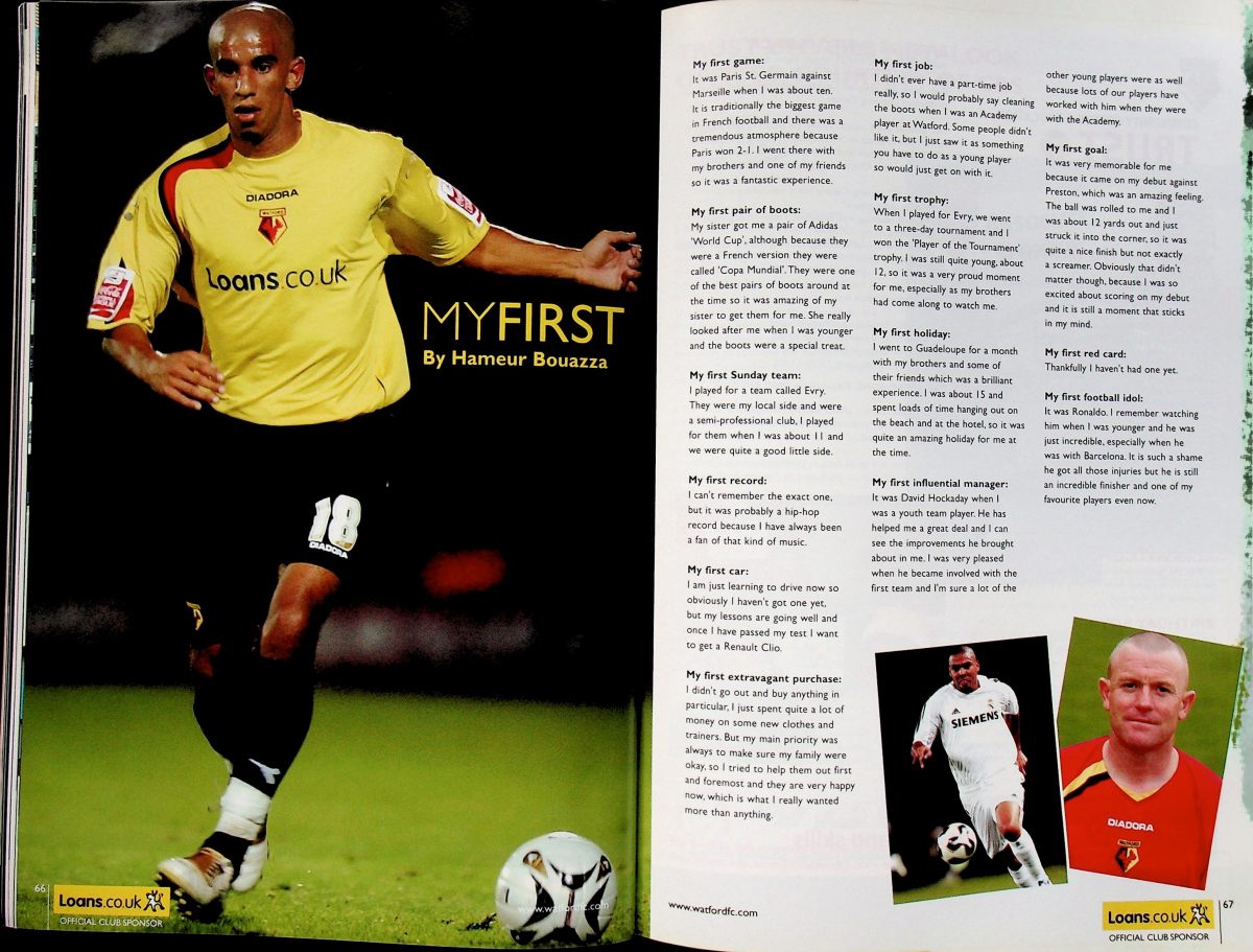 14th February 2004- New Division One, Watford 2 Preston North End 0 Leave a Reply https://watford.fcdb.info/index.php?page=matches Hameur Bouazza scored on his full debut to set up Watford’s victory against Preston at Vicarage Road. So, Preston then. And as I struggle to remember the game’s various events and talking points, one thing is clear above all. This was a good thing. Not just the performance (although it was surely one of the best of the season, if not the best) but for the number of factors that gave the more optimistic supporter something to smile about. Taken from programme on 6th August 2005- Championship, Watford 1 Preston North End 2 Share this: Share on X (Opens in new window) X Share on Facebook (Opens in new window) Facebook