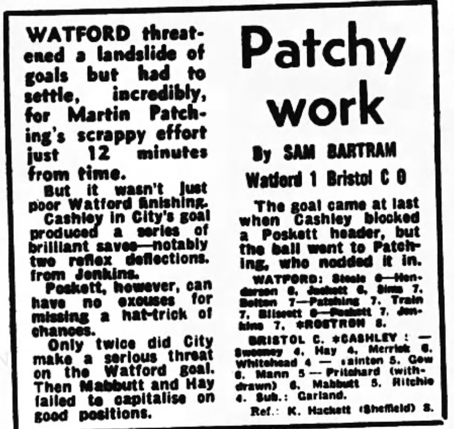 30th August 1980-Division Two, Watford 1 Bristol City 0 Leave a Reply http://watford.fcdb.info?id=3346 Watford Observer match report Sunday People, 31 Aug 1980 Share this: Share on X (Opens in new window) X Share on Facebook (Opens in new window) Facebook