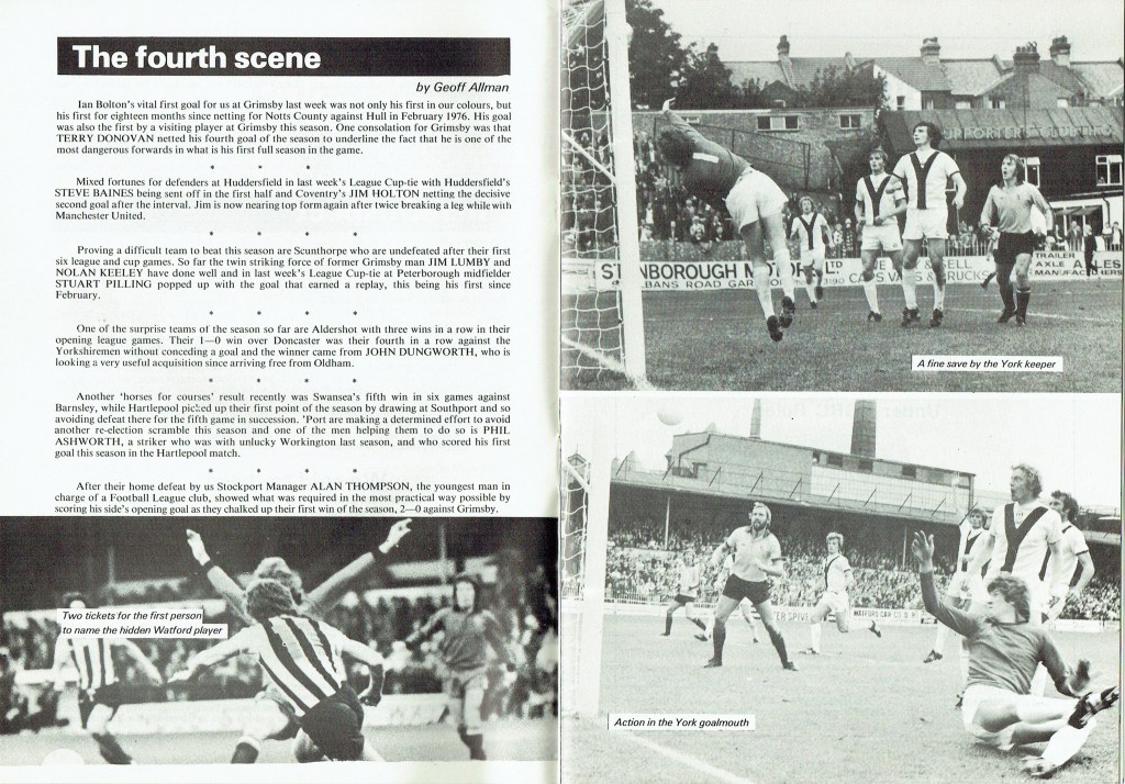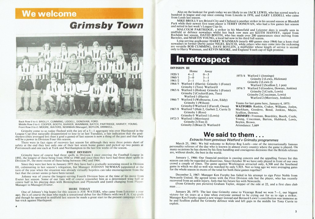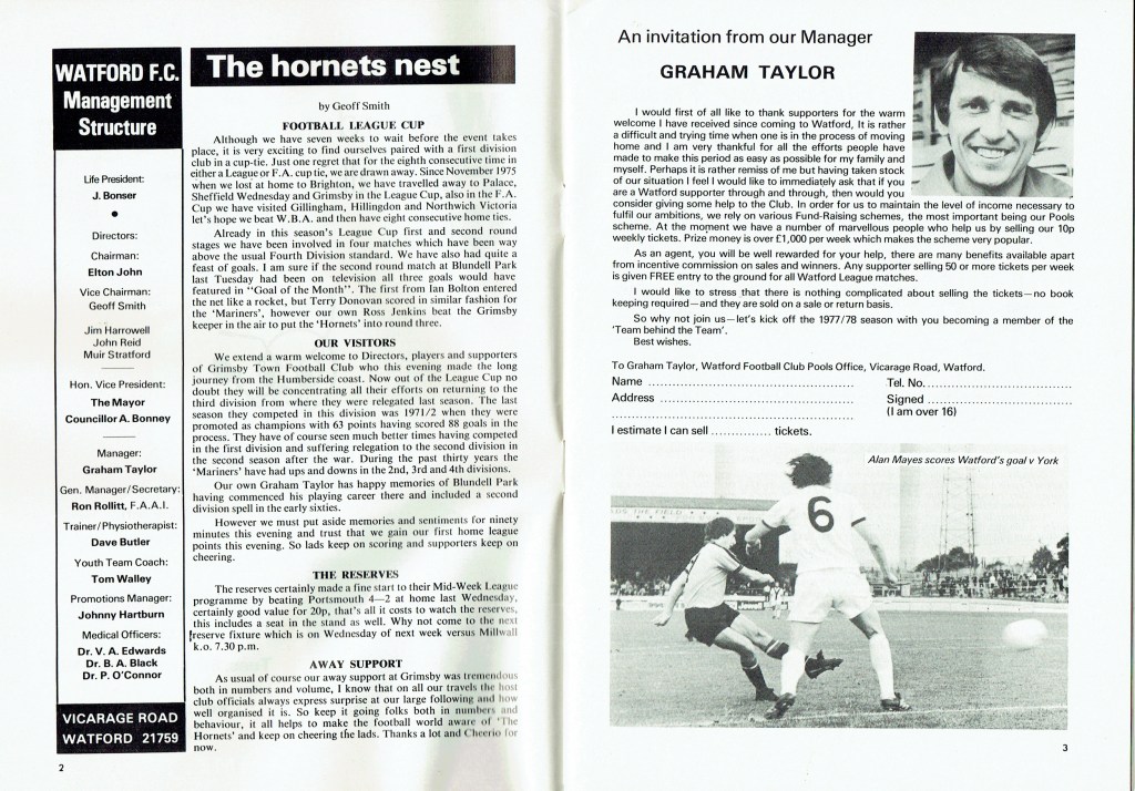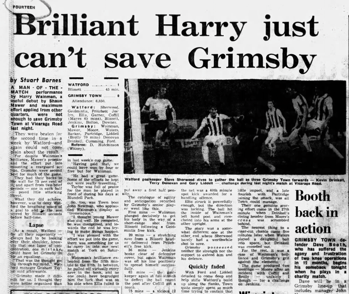 6th September 1977- Division Four, Watford 1 Grimsby Town 0 Leave a Reply https://www.youtube.com/watch?v=T8j1h1ZKn_cThe beginning of this video, shown as part of a montage on the BBC in 2010, was taken from the Watford v Grimsby Town game. http://watford.fcdb.info?id=3187 Grimsby Evening Telegraph, 7 Sep 1977 Daily Telegraph, 7 Sep 1977 Watford Observer match report Share this: Share on X (Opens in new window) X Share on Facebook (Opens in new window) Facebook