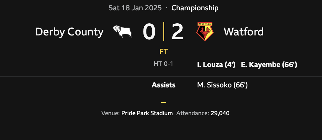Derby 0 Watford 2 minute-by-minute report