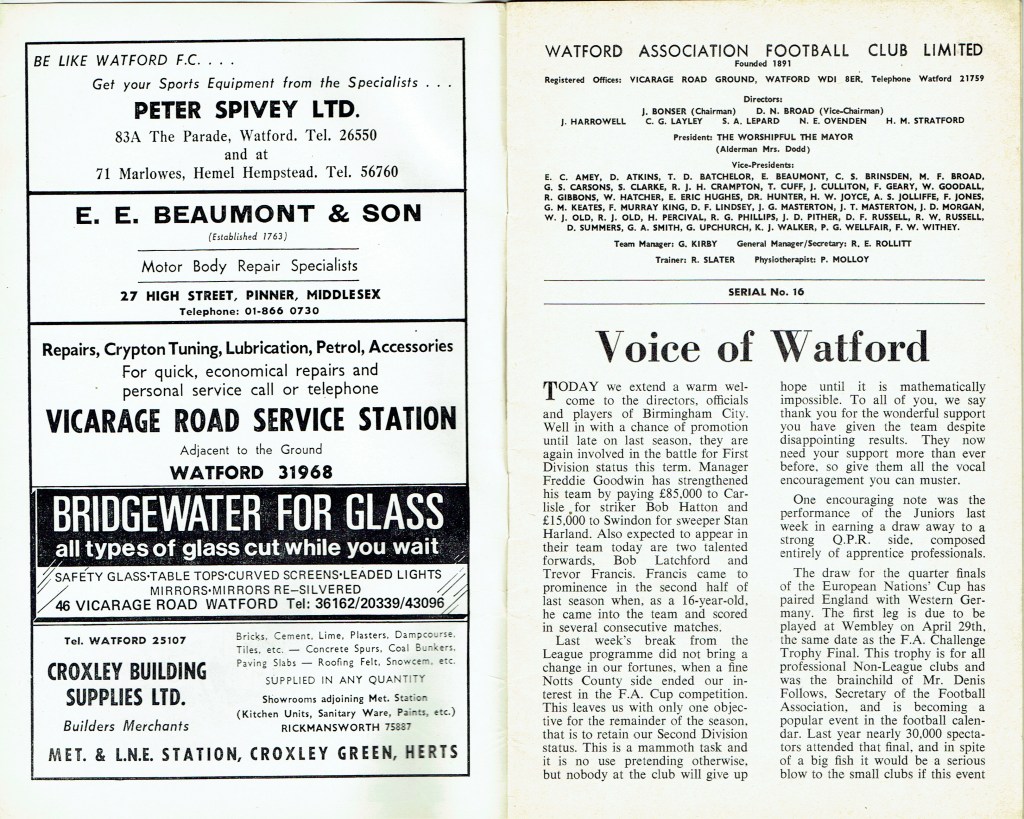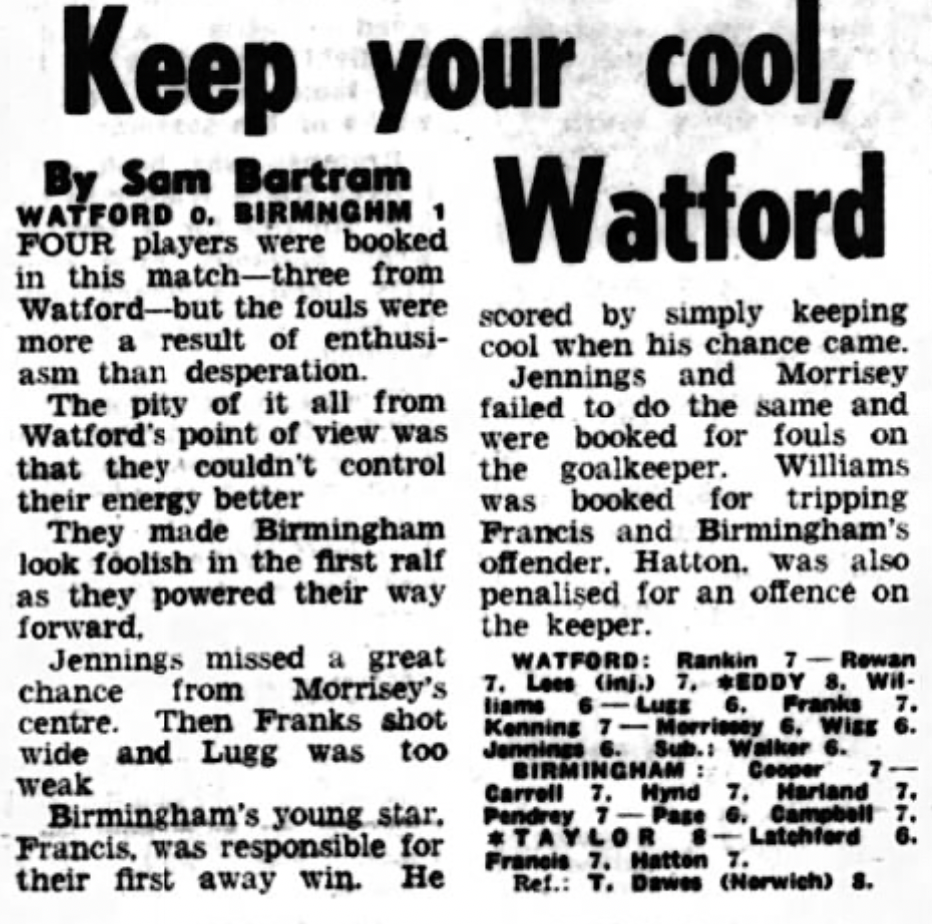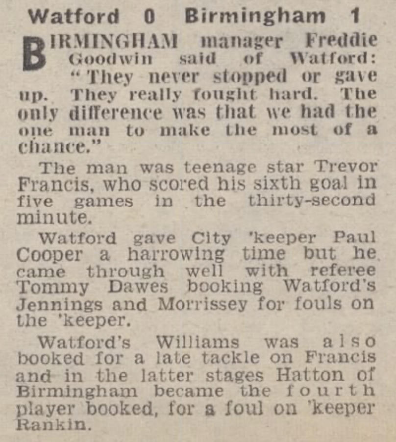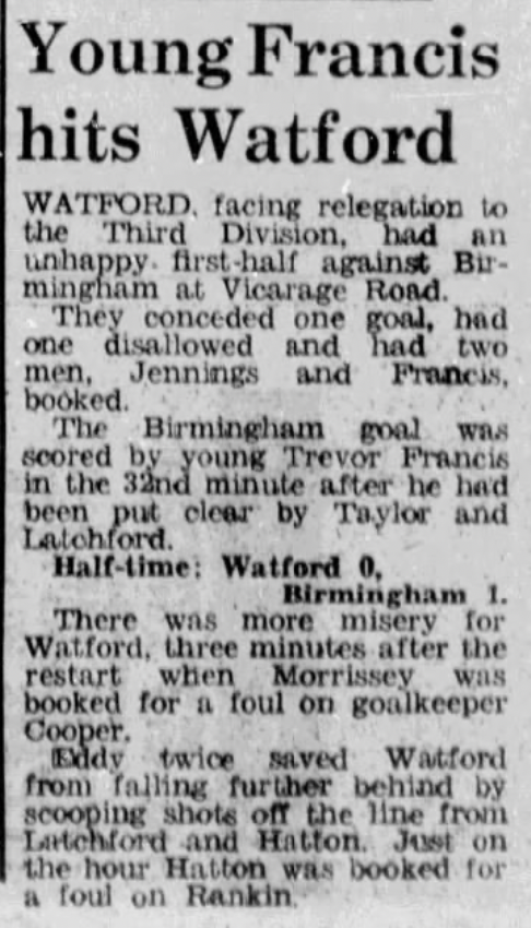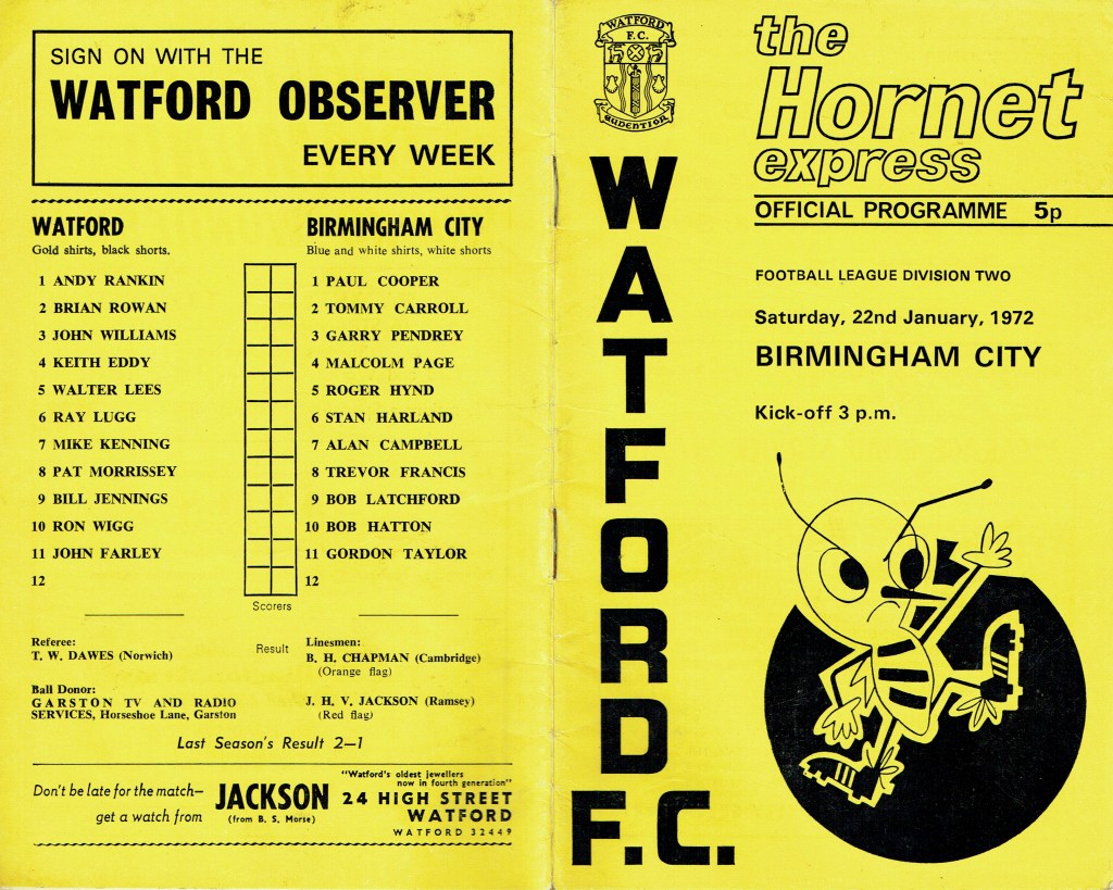 22nd January 1972- Division Two, Watford 0 Birmingham City 1 Leave a Reply http://watford.fcdb.info/index.php?page=matches Evening Standard, 22 Jan 1972 Sunday Mirror, 23 Jan 1972 Sunday People,23 Jan 1972 Watford Observer match report Share this: Click to share on X (Opens in new window) X Click to share on Facebook (Opens in new window) Facebook
