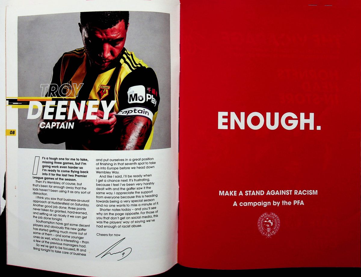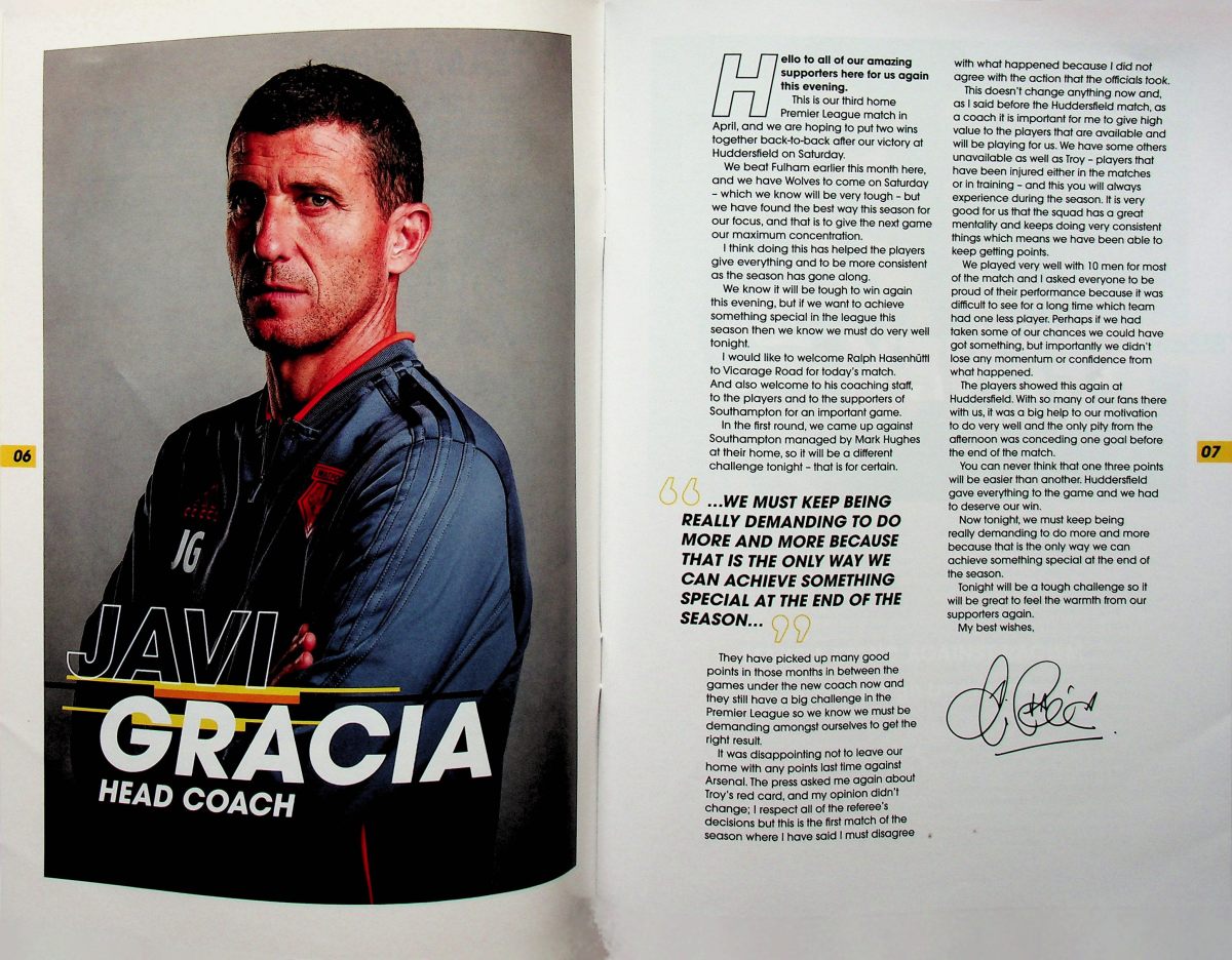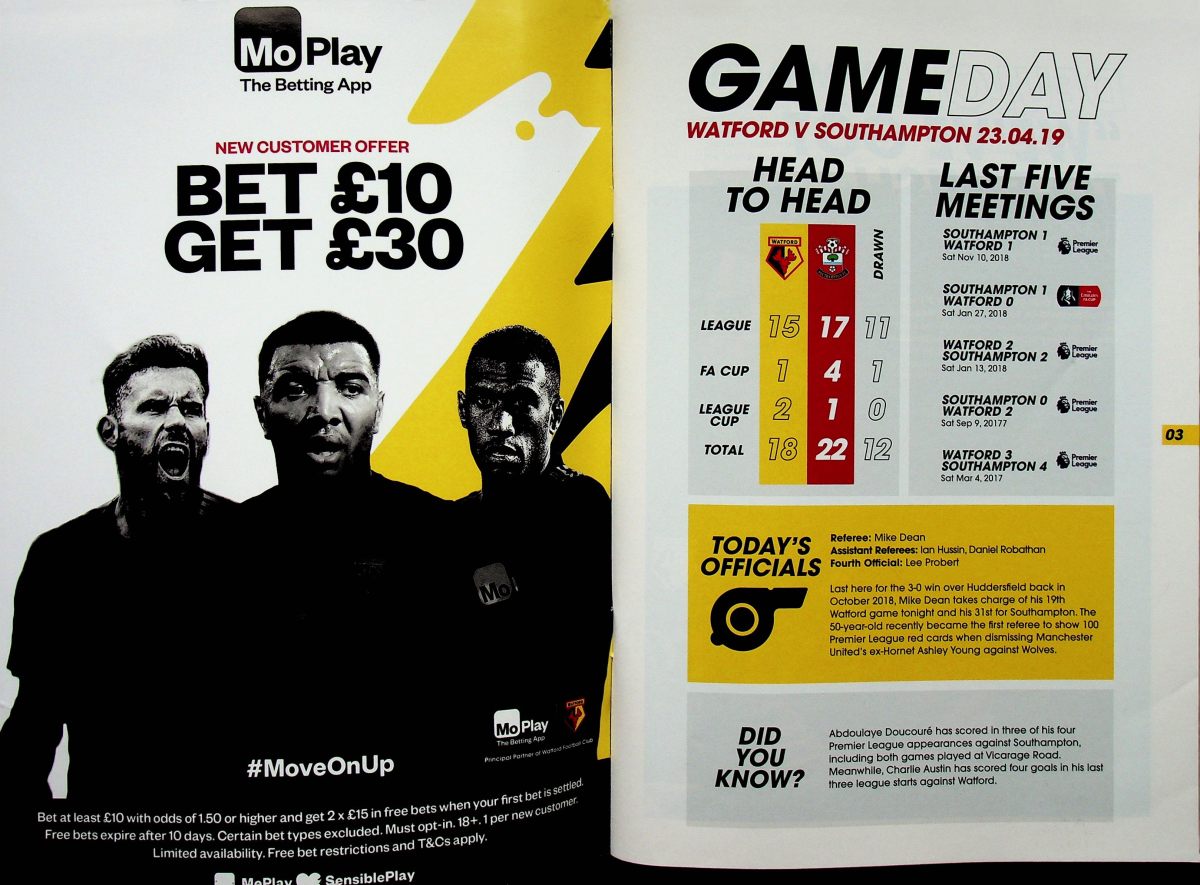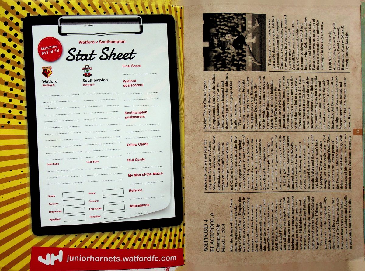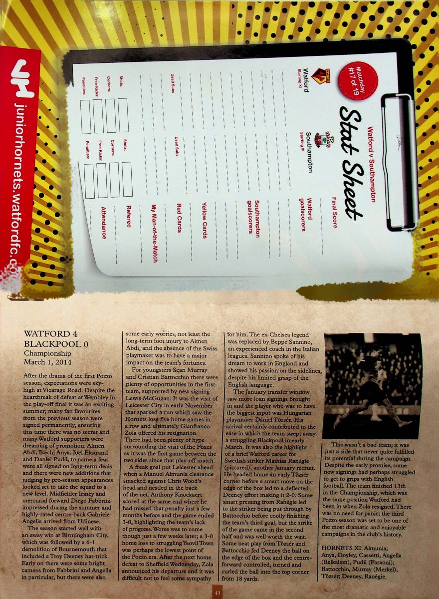 Having finished my pre-match ritual of putting on my replica shirt and retrieving my notebook, pen and camera from my bag, I noticed a big white envelope by my seat. I opened it to find a sheet with the words of “Rocket Man”, as if I don’t already know them. Irritation at this distraction was compounded when I looked up to see Shane Long bearing down on goal and shooting past Foster. Only 7 seconds of the game had elapsed. I had missed Cathcart hitting a pass at Long to lead to this chance. I was devastated and, again, I blamed the decision to dispense with Z-cars. You don’t mess with something so important at such a crucial point in the season.