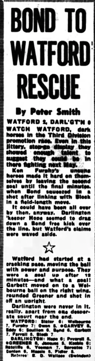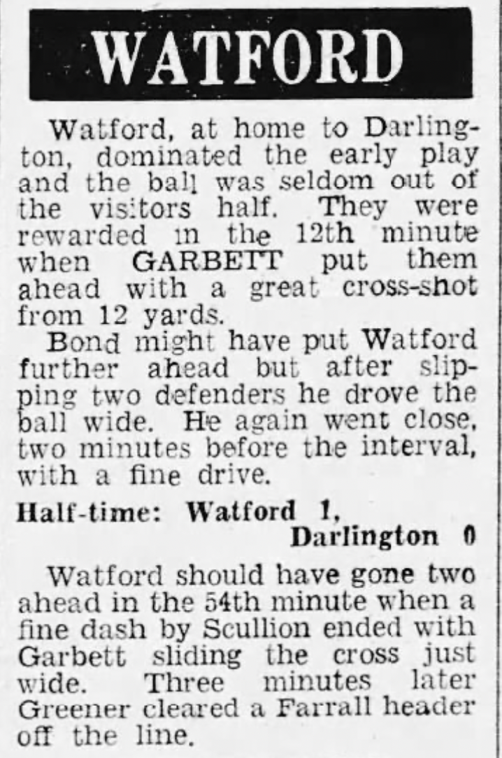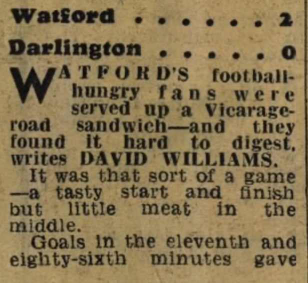 17th December 1966- Division Three, Watford 2 Darlington 0 Leave a Reply Evening Standard, 17 Dec 1966 Sunday Mirror. 18 Dec 1966 Sunday People, 18 Dec 1966 Watford Observer match report Share this: Share on X (Opens in new window) X Share on Facebook (Opens in new window) Facebook