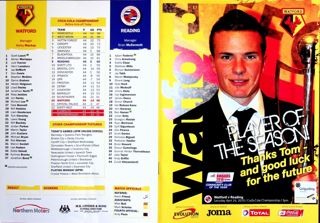 24th April 2010- Championship, Watford 3 Reading 0 Leave a Reply http://watford.fcdb.info?id=4915 Watford secured Championship survival with an impressive win over Reading. Well thank heavens for that. https://www.soccerbase.com/matches/results.sd?date=2010-04-24 https://www.11v11.com/league-tables/league-championship/24-april-2010/ https://oldwatford.com/2019/02/09/9th-february-2019-premier-league-watford-1-everton-0/ Share this: Click to share on X (Opens in new window) X Click to share on Facebook (Opens in new window) Facebook