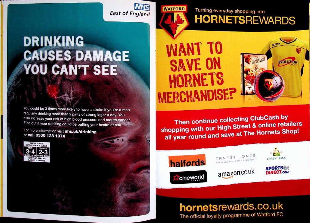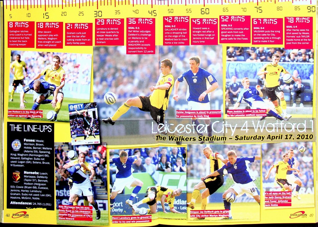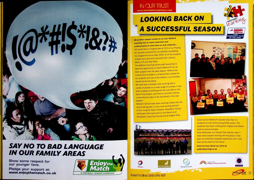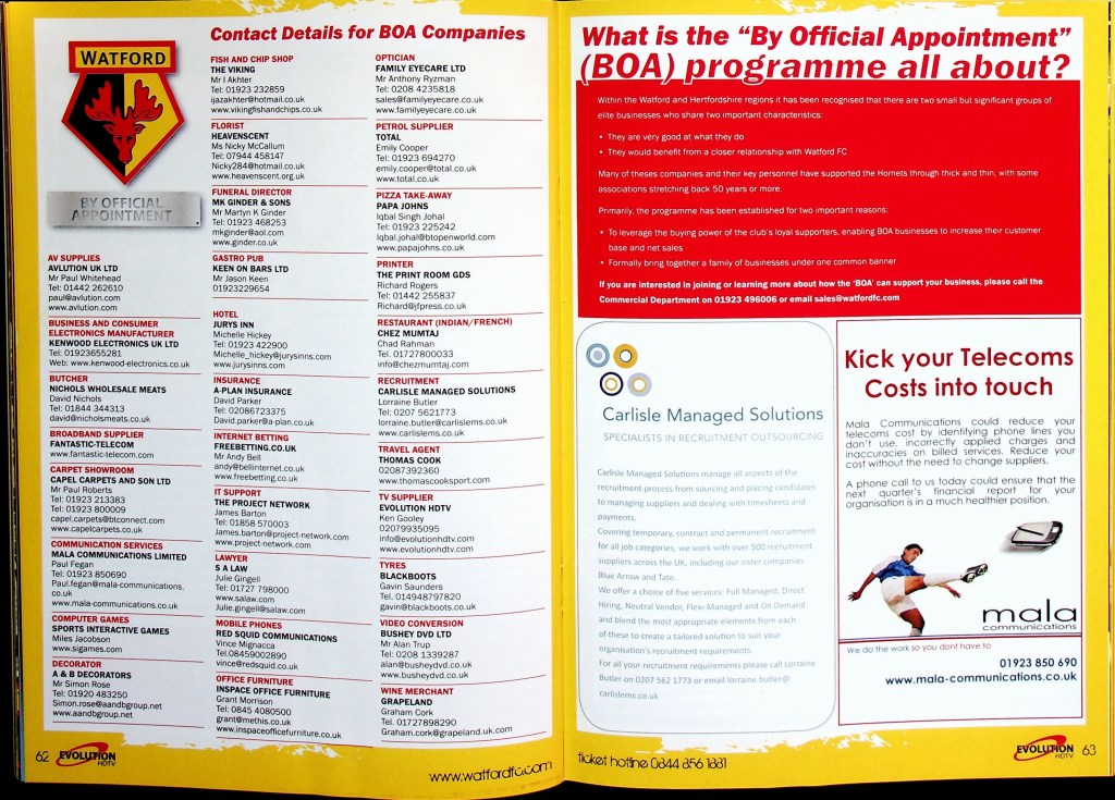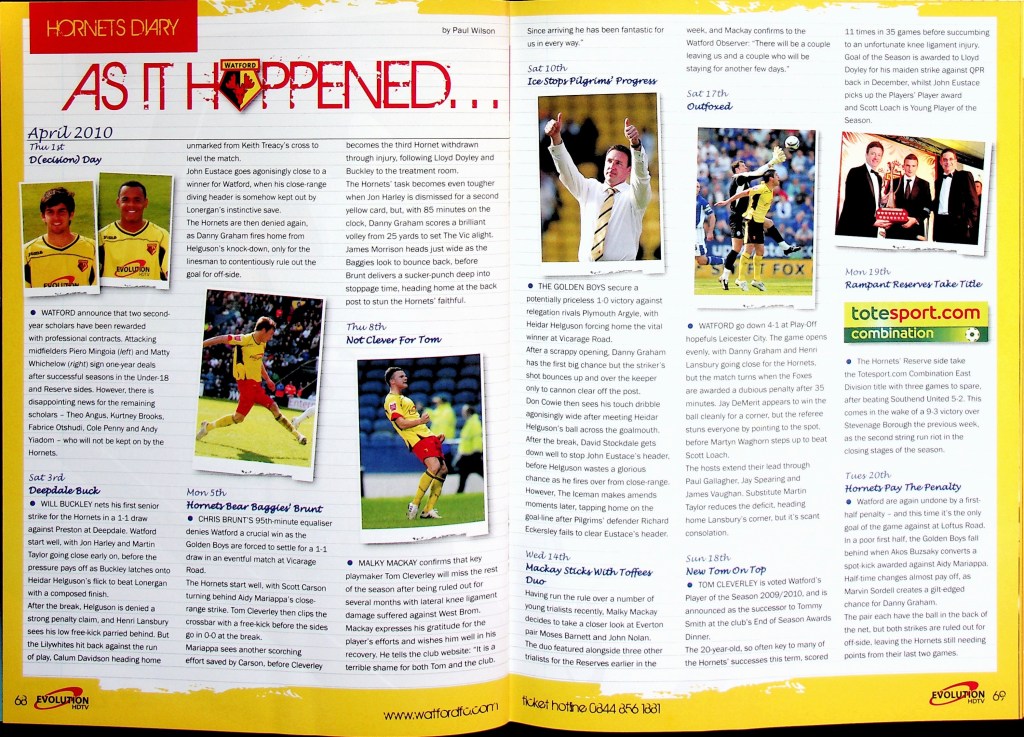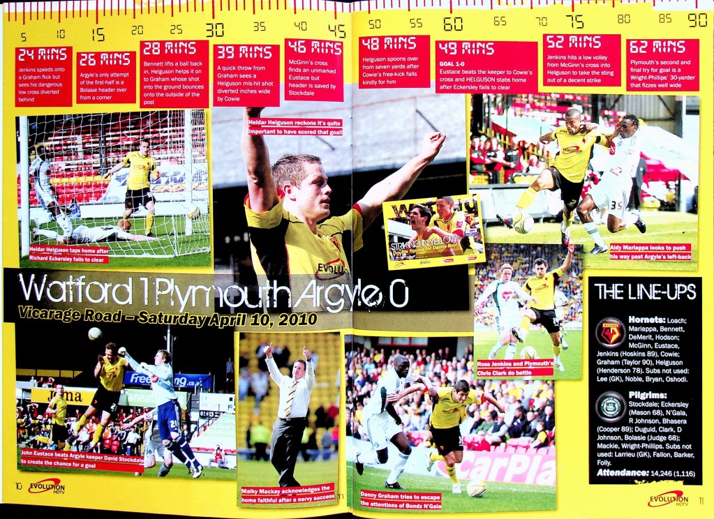 5th April 2010- Championship, Watford 1 West Bromwich Albion 1 Leave a Reply http://watford.fcdb.info?id=4911 Chris Brunt scored a dramatic equaliser five minutes into injury time to rescue West Brom and break Watford hearts. The relegation-threatened hosts looked set to claim a vital win after Danny Graham’s superb long-range strike with only five minutes left to play. Malky Mackay’s team showed grit after losing their top scorer Tom Cleverley, who was taken off on a stretcher wearing an oxygen mask after being caught on the ankle by Jonas Olsson, then having Jon Harley sent off, to take the lead in the85th minute through Danny Graham’s 25-yard shot. It was a tense affair from the start with Watford fighting to remain in the Championship and Albion knowing that, by this evening they could be back in the Premier League. There was a point in the second half where the floodlights came on just as the sun came out. “What an odd day,” was the instinctive thought, which lead to the reflection that an odd day might be required in overturning our fifteen-year league hoodoo against the Albion. It didn’t quite happen, although the rueful “I’d take a draw from here” sentiment as Jon Harley departed was severely tested… https://www.soccerbase.com/matches/results.sd?date=2010-04-05 https://www.11v11.com/league-tables/league-championship/05-april-2010/ Share this: Click to share on X (Opens in new window) X Click to share on Facebook (Opens in new window) Facebook