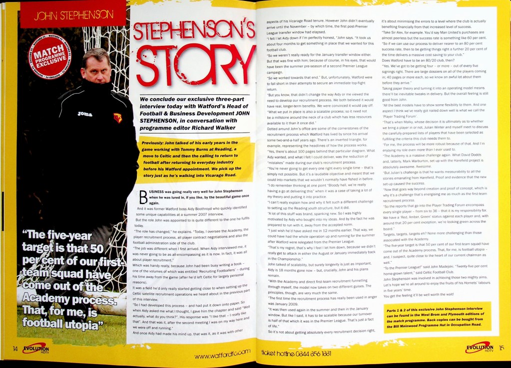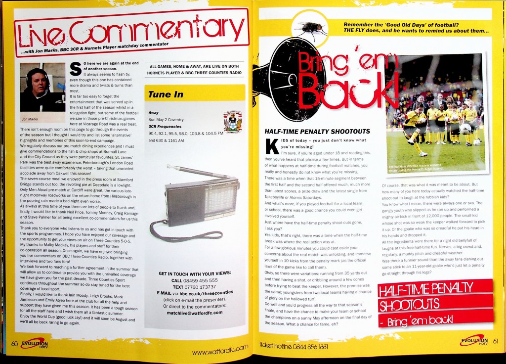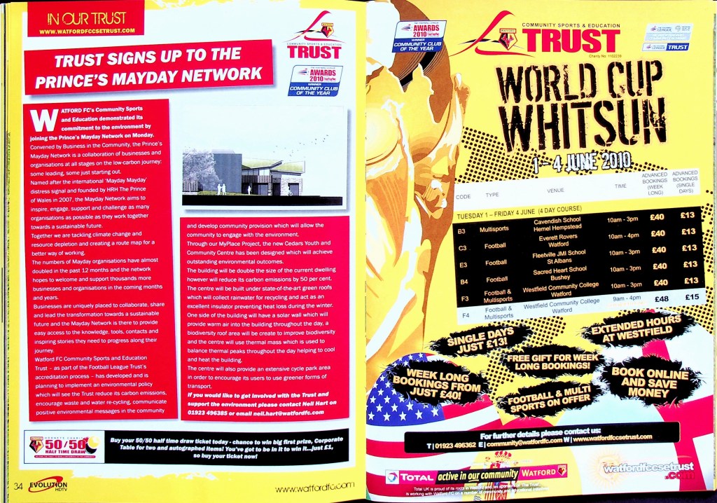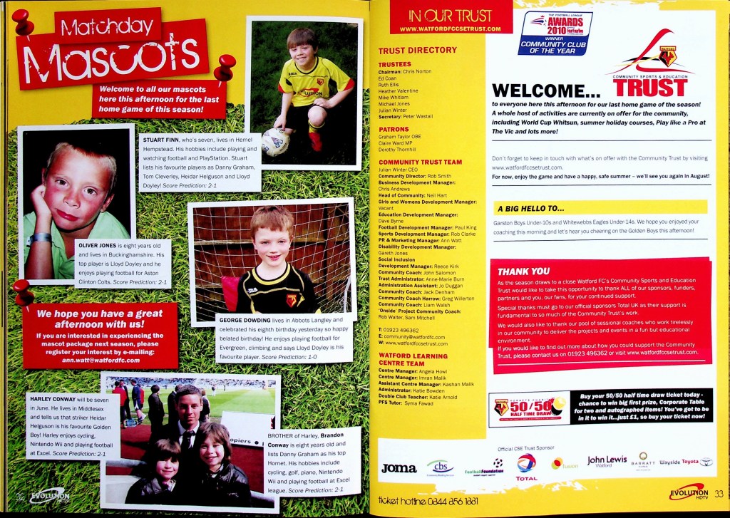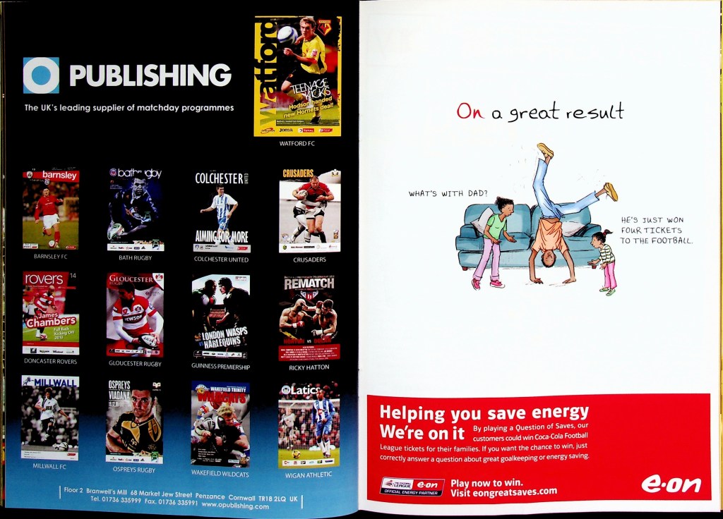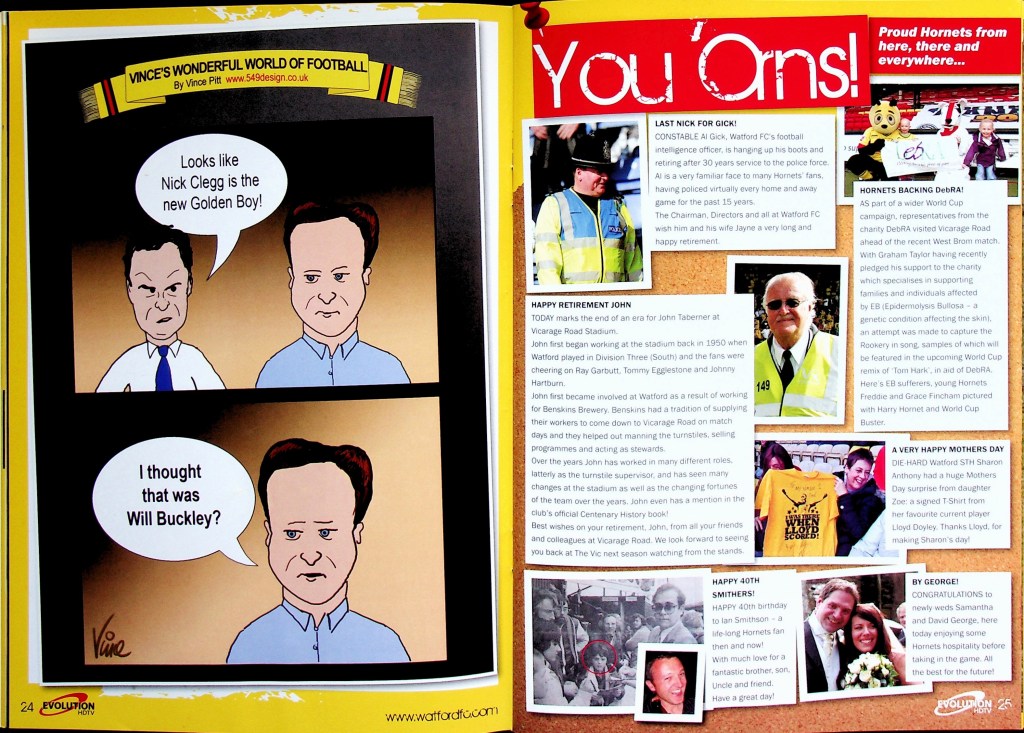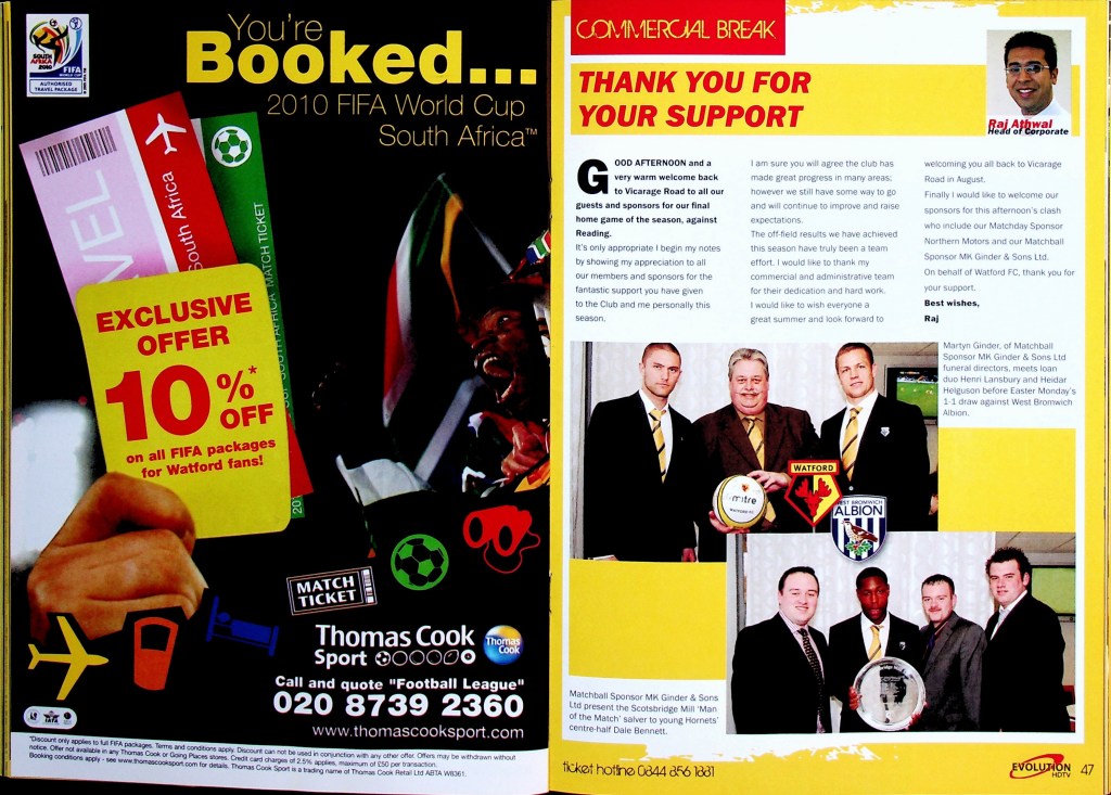5th April 2010- Championship, Watford 1 West Bromwich Albion 1 Leave a Reply http://watford.fcdb.info?id=4911 Chris Brunt scored a dramatic equaliser five minutes into injury time to rescue West Brom and break Watford hearts. The relegation-threatened hosts looked set to claim a vital win after Danny Graham’s superb long-range strike with only five minutes left to play. Malky Mackay’s team showed grit after losing their top scorer Tom Cleverley, who was taken off on a stretcher wearing an oxygen mask after being caught on the ankle by Jonas Olsson, then having Jon Harley sent off, to take the lead in the85th minute through Danny Graham’s 25-yard shot. It was a tense affair from the start with Watford fighting to remain in the Championship and Albion knowing that, by this evening they could be back in the Premier League. There was a point in the second half where the floodlights came on just as the sun came out. “What an odd day,” was the instinctive thought, which lead to the reflection that an odd day might be required in overturning our fifteen-year league hoodoo against the Albion. It didn’t quite happen, although the rueful “I’d take a draw from here” sentiment as Jon Harley departed was severely tested… https://www.soccerbase.com/matches/results.sd?date=2010-04-05 https://www.11v11.com/league-tables/league-championship/05-april-2010/ Share this: Click to share on X (Opens in new window) X Click to share on Facebook (Opens in new window) Facebook