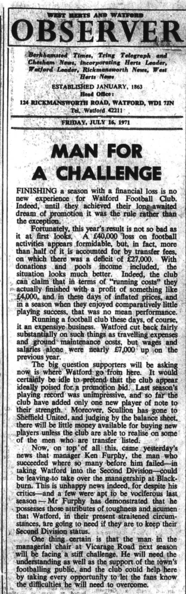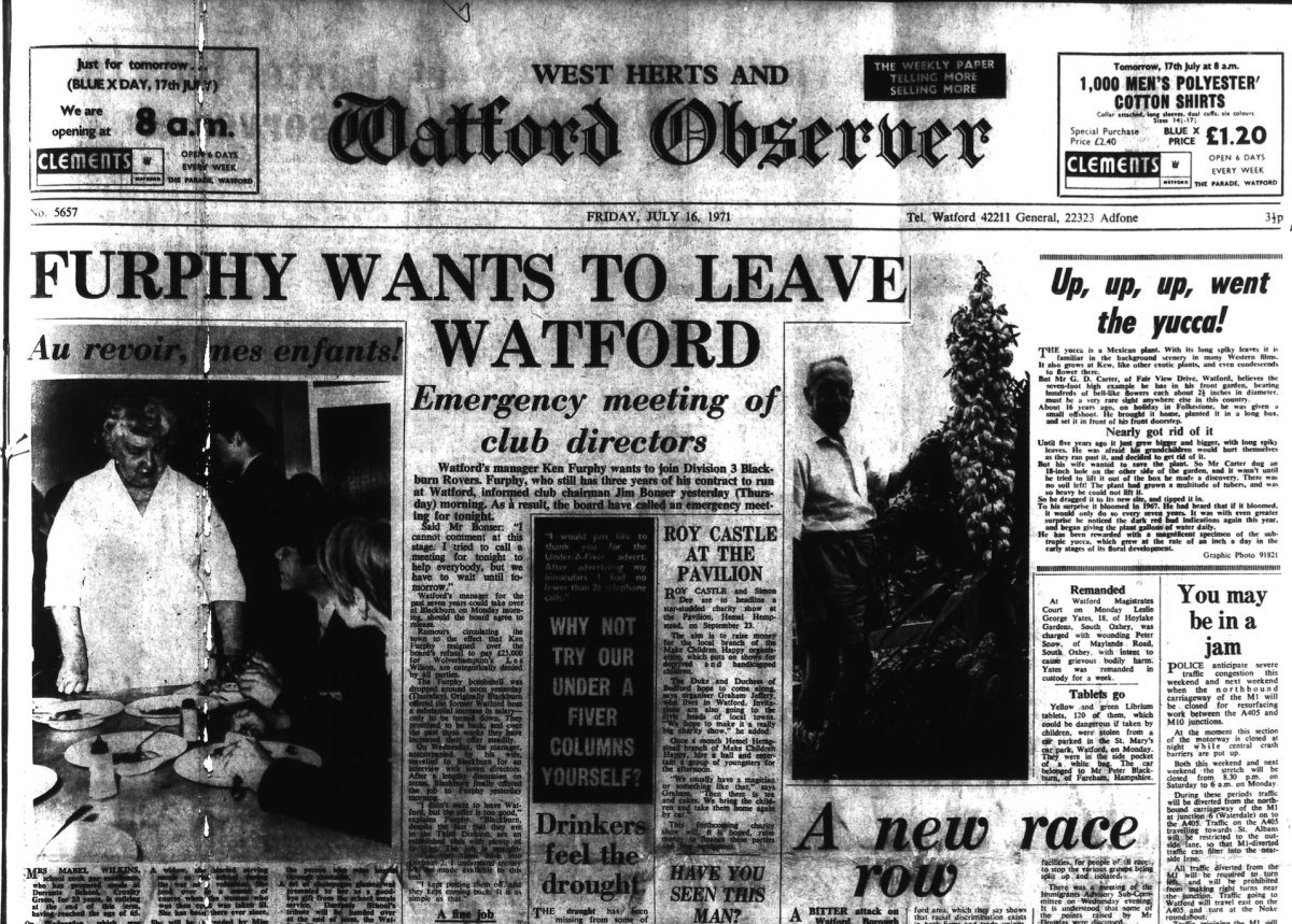 16th July 1971- Watford Observer and other newspaper reports that the Watford board have agreed to release manager Ken Furphy from his contract Evening Standard, 15 Jul 1971 Evening Standard, 16 Jul 1971 Evening Standard, 17 Jul 1971 Evening Standard, 22 Jul 1971 Evening Standard, 29 Jul 1971 Share this: Click to share on X (Opens in new window) X Click to share on Facebook (Opens in new window) Facebook