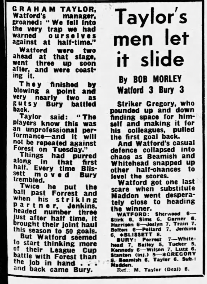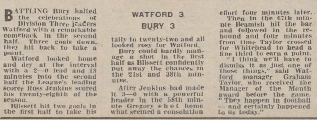 20th January 1979-Division Three, Watford 3 Bury 3 Leave a Reply Watford Observer match report Sunday Mirror, 21 Jan 1979 Sunday People, 21 January 1979 9th March 2010- Championship, Watford 0 Swansea City 1 Share this: Share on X (Opens in new window) X Share on Facebook (Opens in new window) Facebook