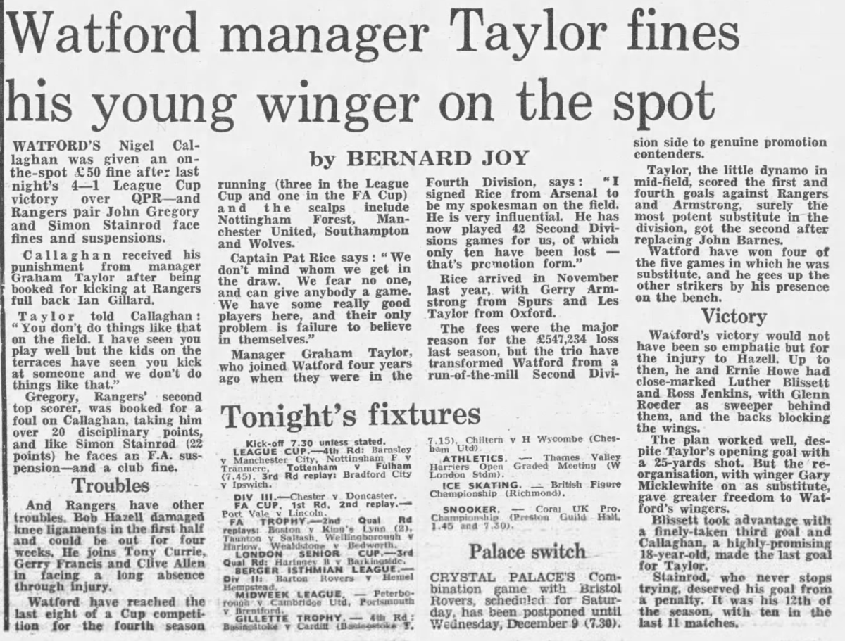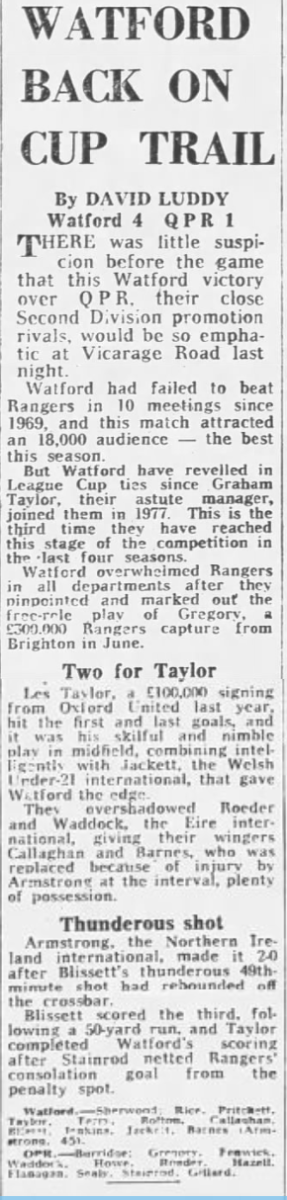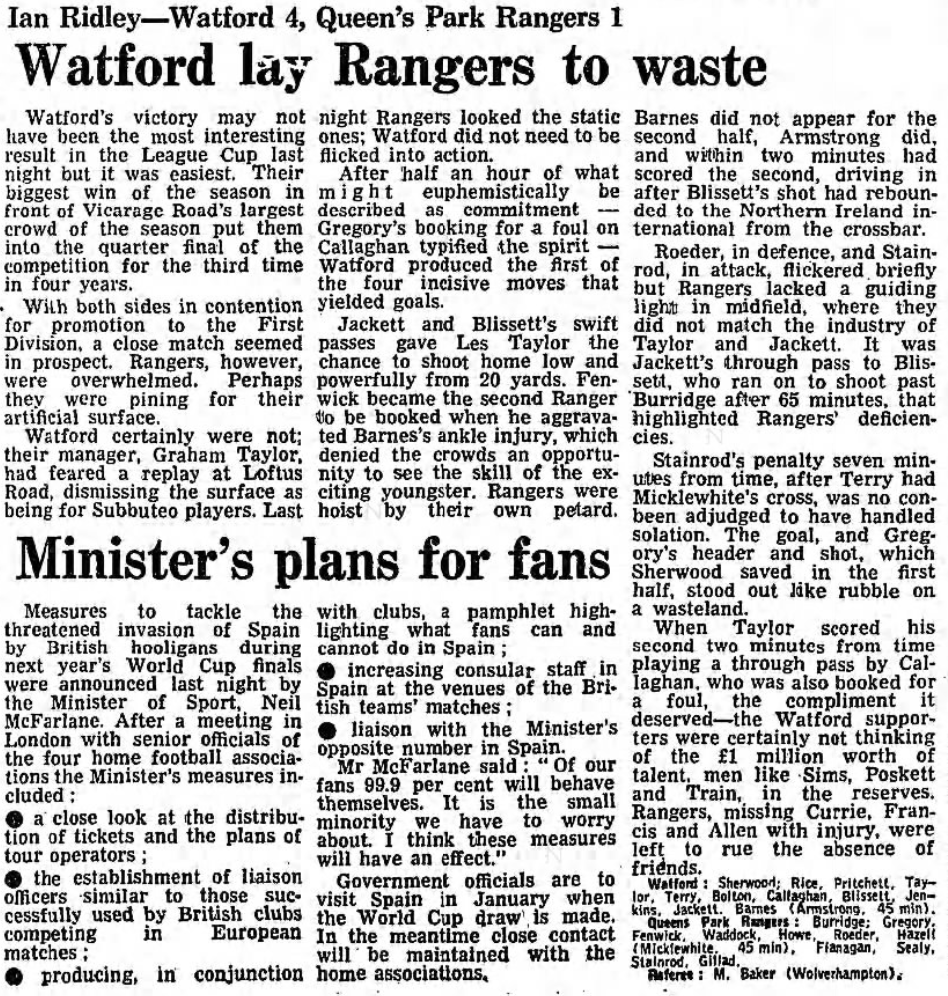 1st December 1981- League Cup Fourth Round, Watford 4 Queens Park Rangers 1 Leave a Reply http://watford.fcdb.info?s=40867&id=3416 Guardian, 2 Dec 1981 Daily Telegraph, 2 Dec 1981 Evening Standard, 2 Dec 1981 Share this: Share on X (Opens in new window) X Share on Facebook (Opens in new window) Facebook