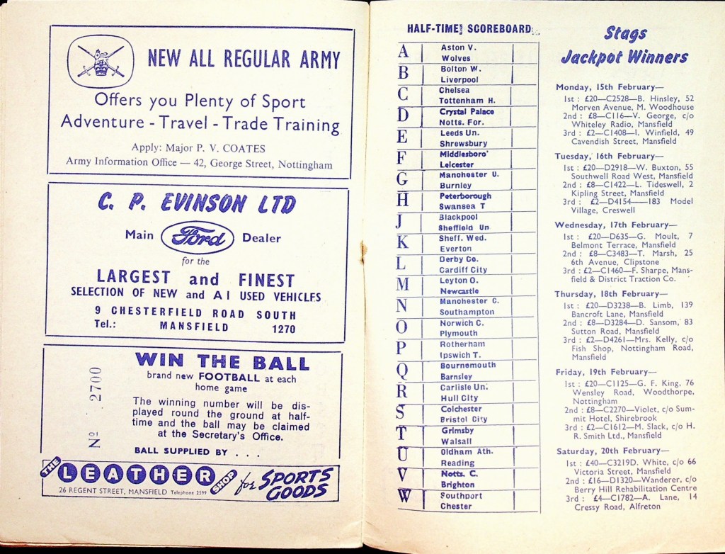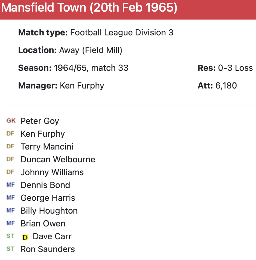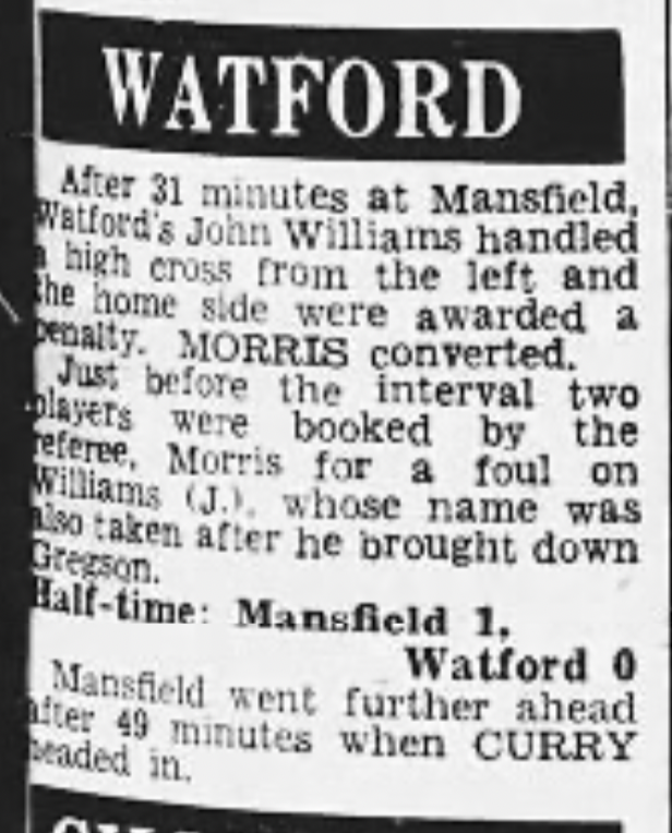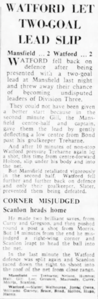 20th February 1965- Division Three, Mansfield Town 3 Watford 0 Leave a Reply Sunday People, 20 Feb 1965 Watford Observer match report http://watford.fcdb.info/index.php?page=matches https://www.soccerbase.com/matches/results.sd?date=1965-02-20 https://www.11v11.com/league-tables/league-division-three/20-february-1965/ Share this: Share on X (Opens in new window) X Share on Facebook (Opens in new window) Facebook