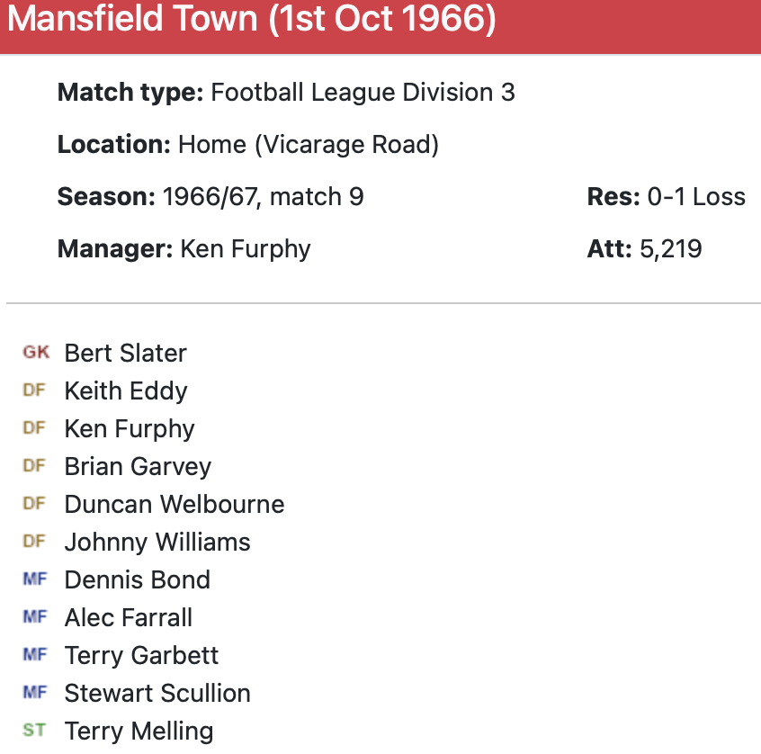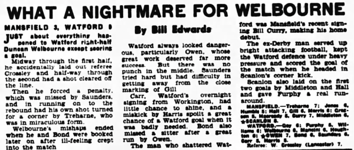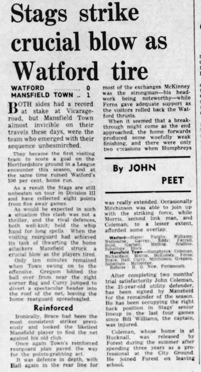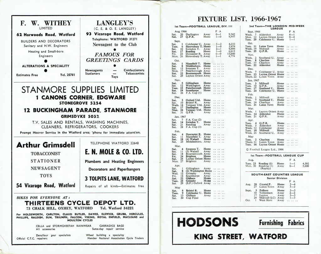 1st October 1966- Division Three, Watford 0 Mansfield Town 1 Leave a Reply Sunday People, 2 Oct 1966 Guardian Journal, 3 Oct 1966 Watford Observer match report http://watford.fcdb.info/index.php?page=matches Share this: Share on X (Opens in new window) X Share on Facebook (Opens in new window) Facebook