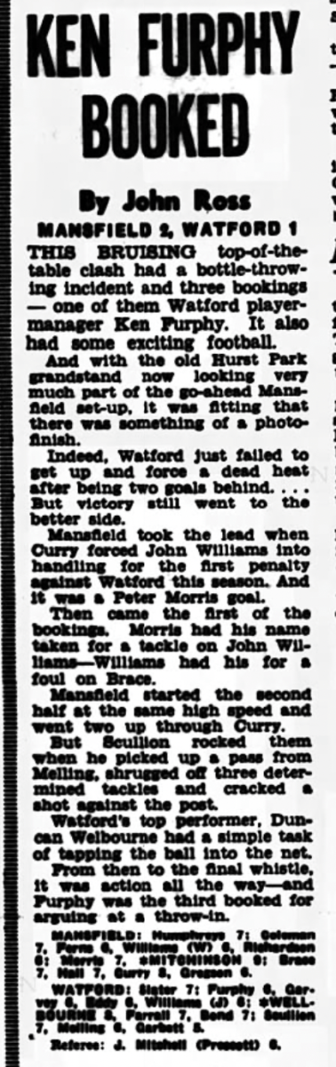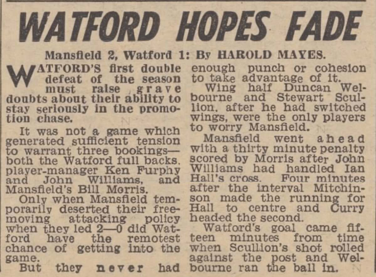 14th September 1965-Division Three, Watford 2 Mansfield Town 1 Leave a Reply http://watford.fcdb.info?id=2583 Daily Mirror, 15 Sep 1965 Daily Telegraph, 15 Sep 1965 Watford Observer match report Share this: Share on X (Opens in new window) X Share on Facebook (Opens in new window) Facebook