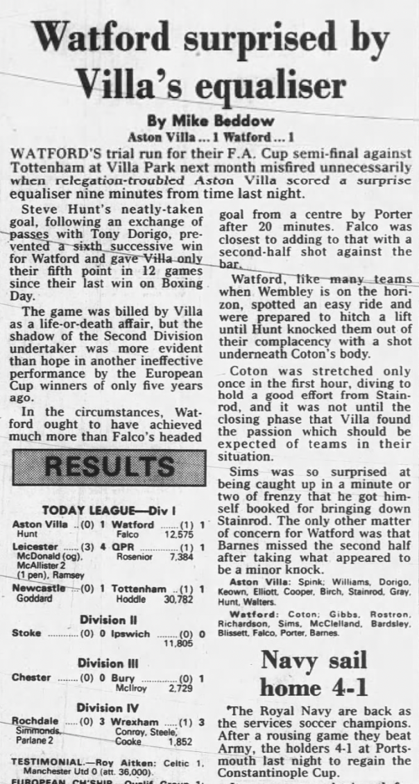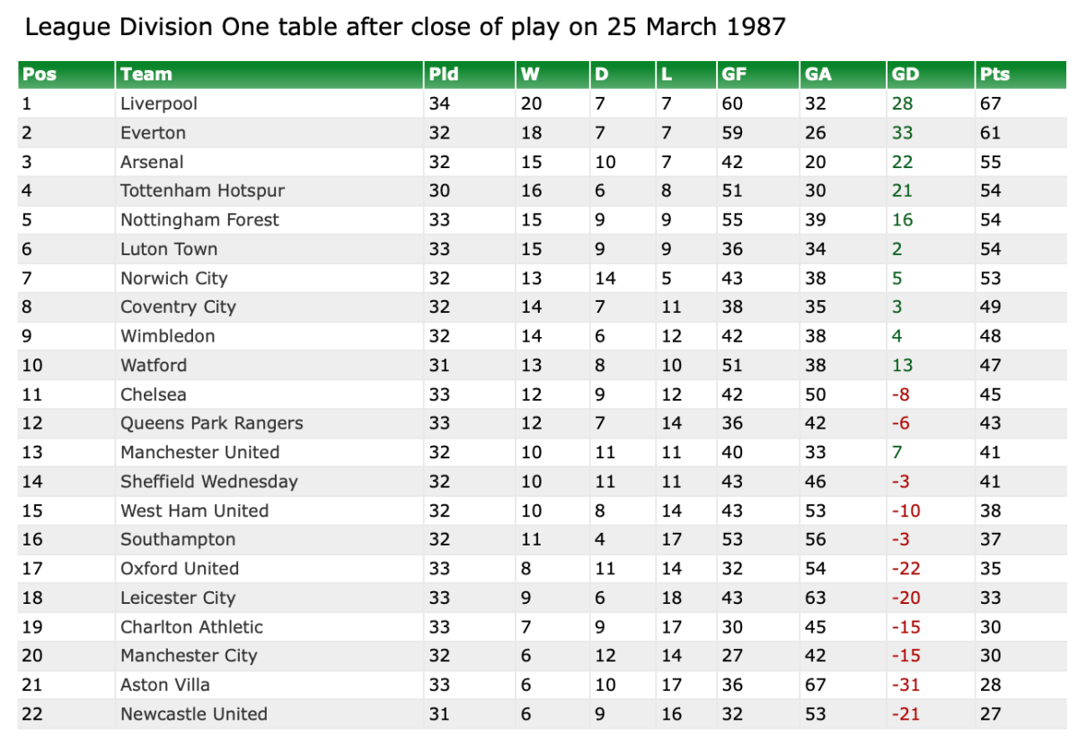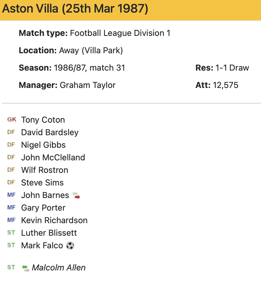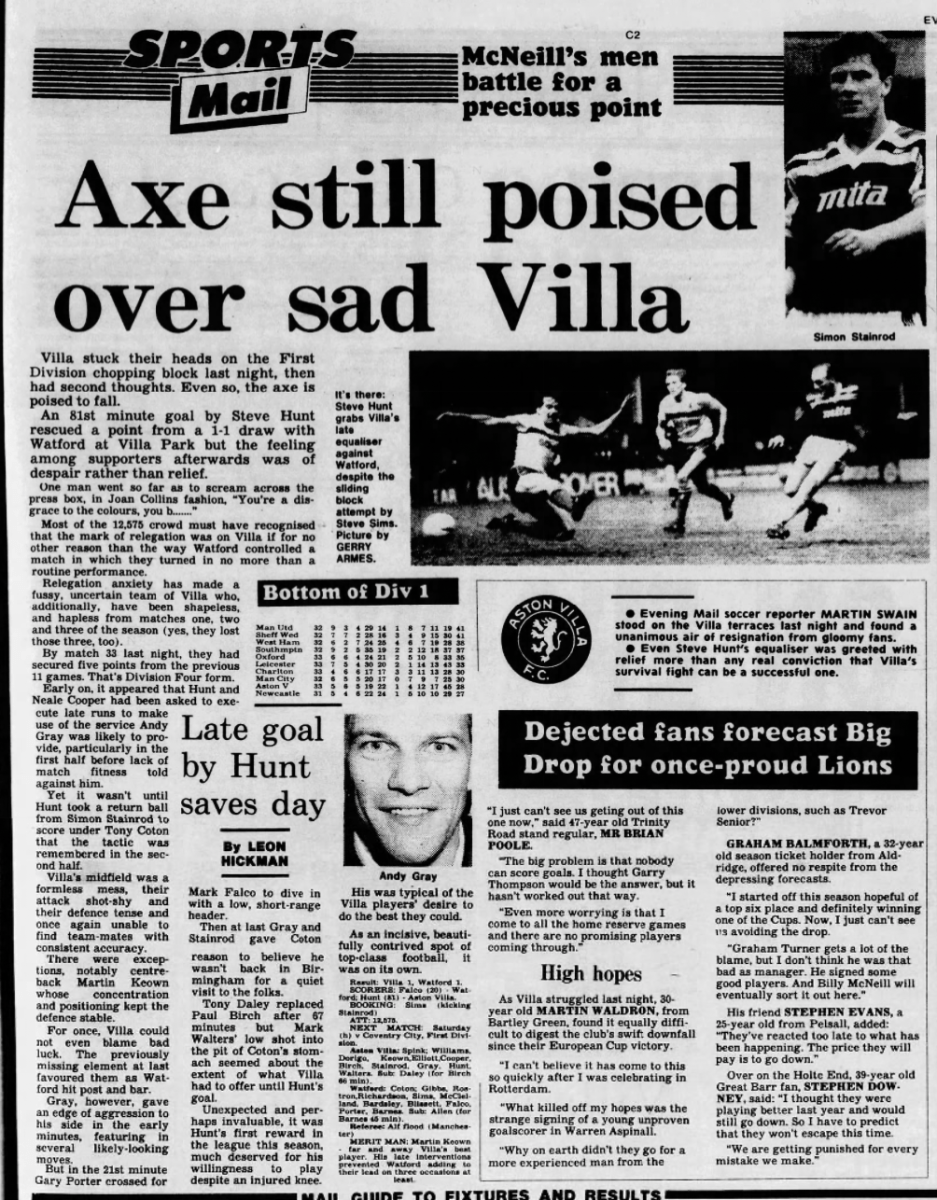 25th March 1987- Division One, Aston Villa 1 Watford 1 Birmingham Evening Mail, 26 Mar 1987 Daily Telegraph, 26 Mar 1987 https://www.11v11.com/league-tables/league-division-one/25-march-1987/#google_vignette Share this: Click to share on X (Opens in new window) X Click to share on Facebook (Opens in new window) Facebook