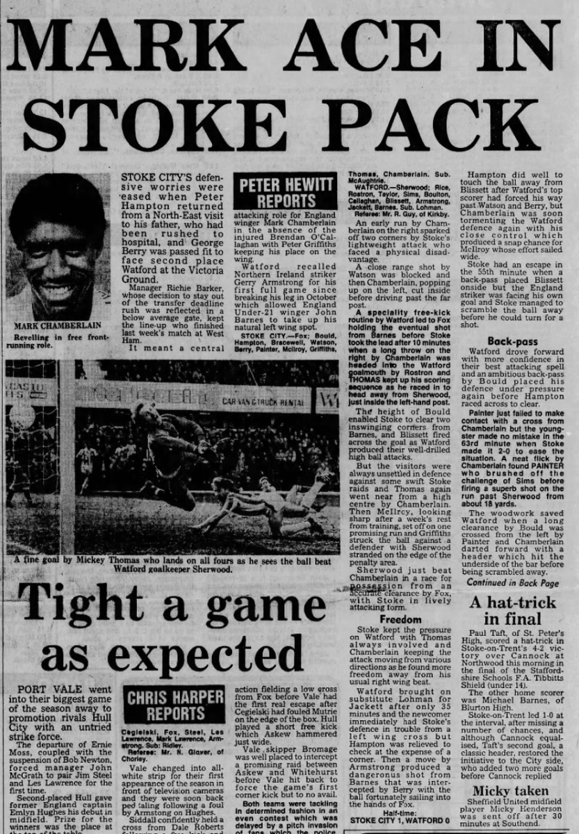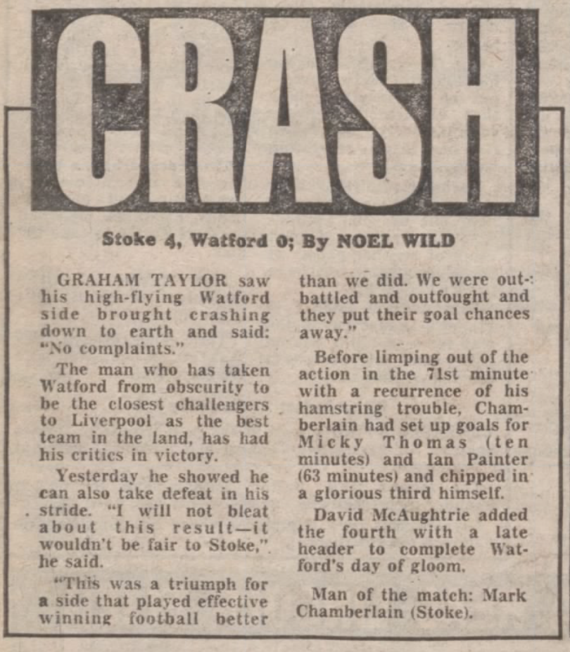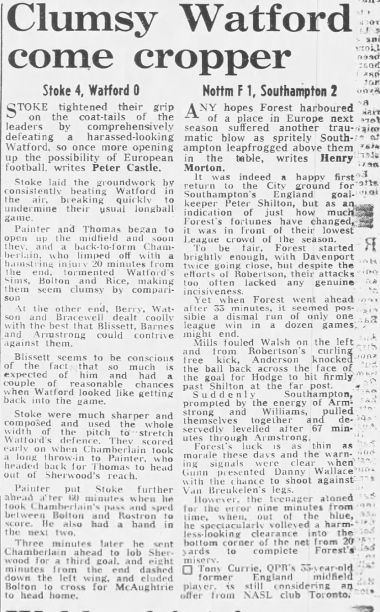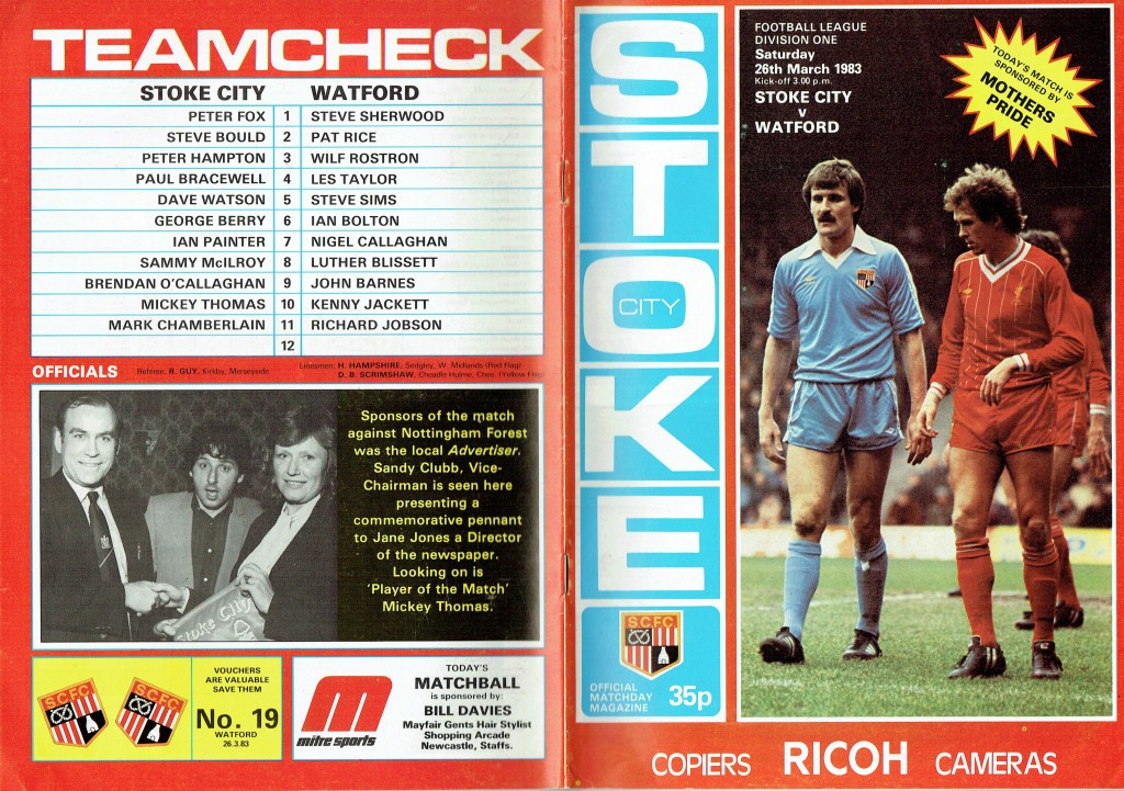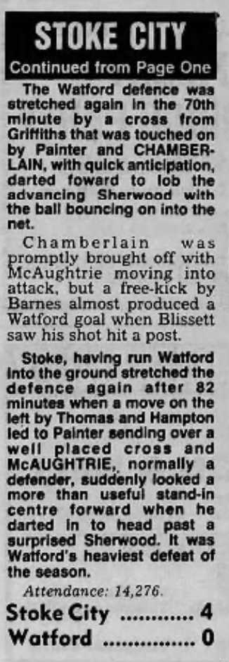 26th March 1983- Division One, Stoke City 4 Watford 0 Leave a Reply http://watford.fcdb.info?id=3491 Evening Sentinel, 26 Mar 1983 Sunday People, 27 Mar 1983 Sunday Telegraph, 27 Mar 1983 Sunday Mirror, 27 Mar 1983 https://oldwatford.com/2013/04/06/6th-april-2013-championship-watford-0-cardiff-city-0/ Share this: Share on X (Opens in new window) X Share on Facebook (Opens in new window) Facebook
