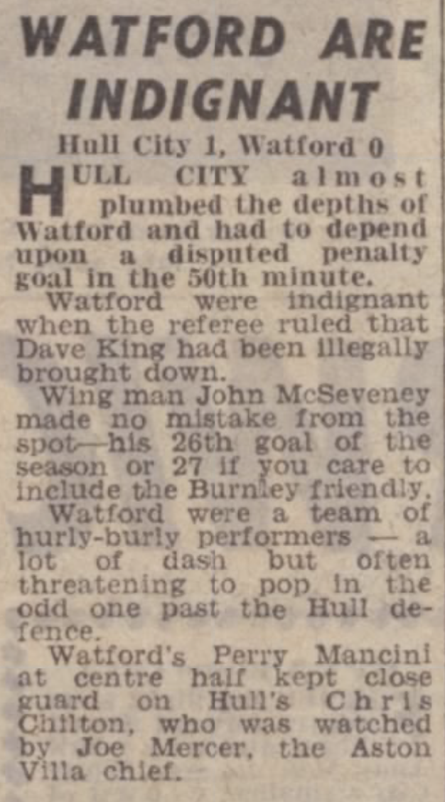 30th March 1963- Division Three, Hull City 1 Watford 0 Leave a Reply http://watford.fcdb.info?id=2465 Sunday Mirror, 31 Mar 1963 Watford Observer match report https://www.soccerbase.com/matches/results.sd?date=1963-03-30 https://www.11v11.com/league-tables/league-division-three/30-march-1963/ Share this: Share on X (Opens in new window) X Share on Facebook (Opens in new window) Facebook