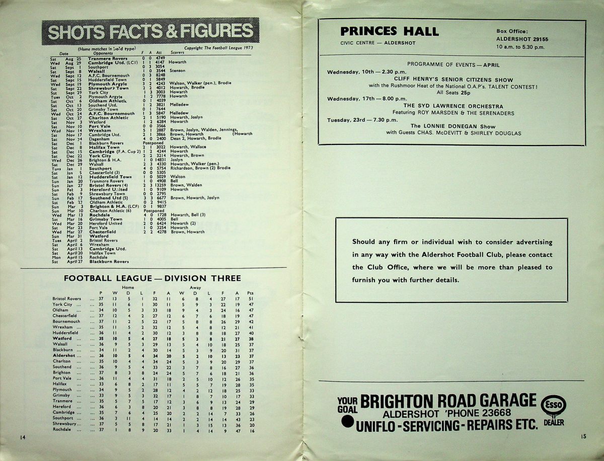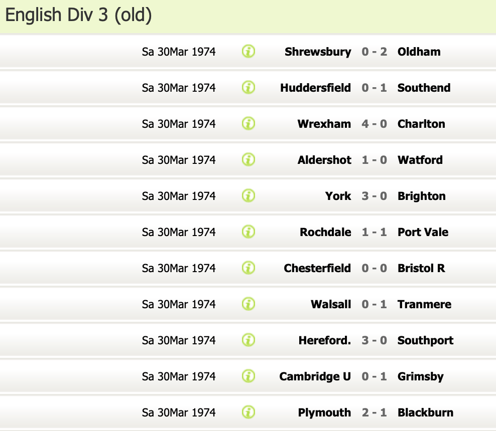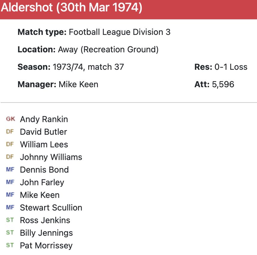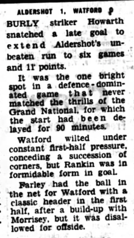 30th March 1974- Division Three, Aldershot 1 Watford 0 https://watford.fcdb.info/index.php?page=matches Sunday People, 31 Mar 1974 Watford Observer match report https://www.soccerbase.com/matches/results.sd?date=1974-03-30 https://www.11v11.com/league-tables/league-division-three/30-march-1974/#google_vignette Share this: Share on X (Opens in new window) X Share on Facebook (Opens in new window) Facebook